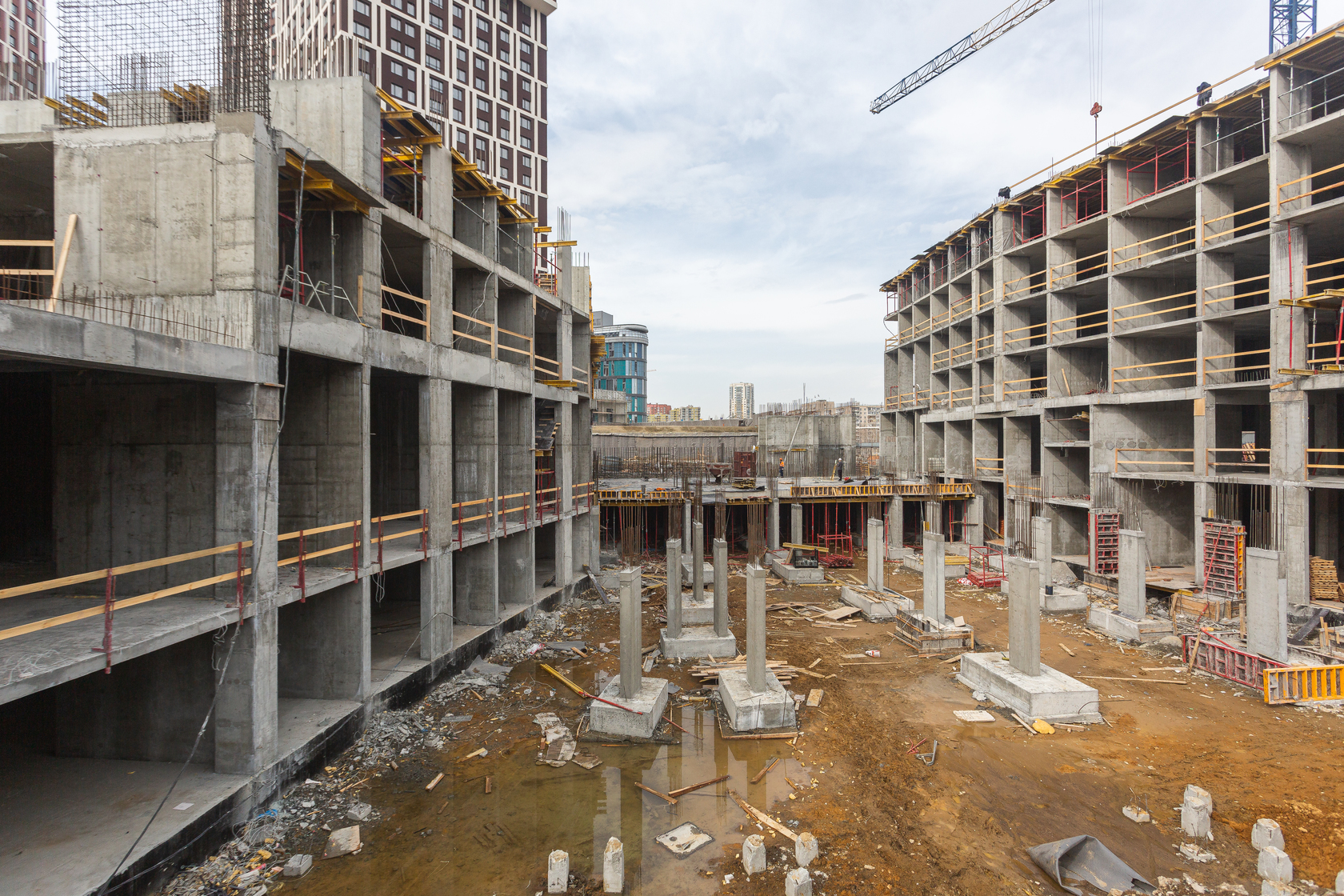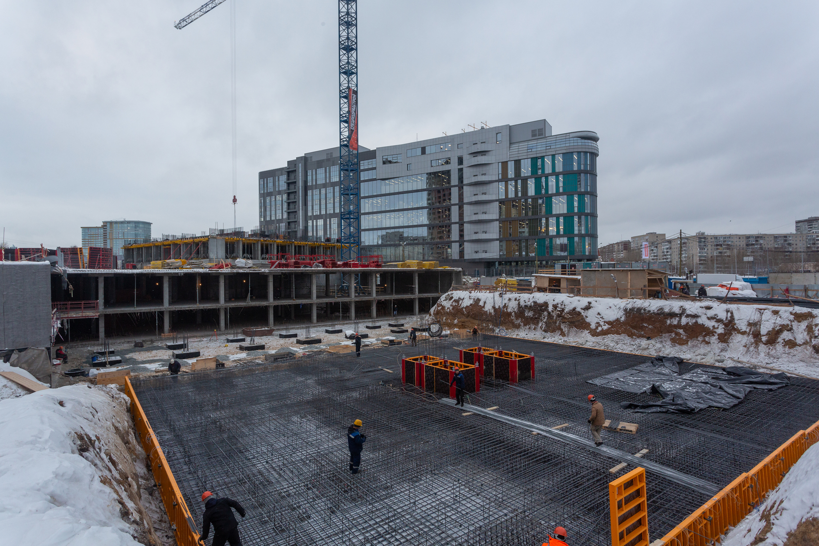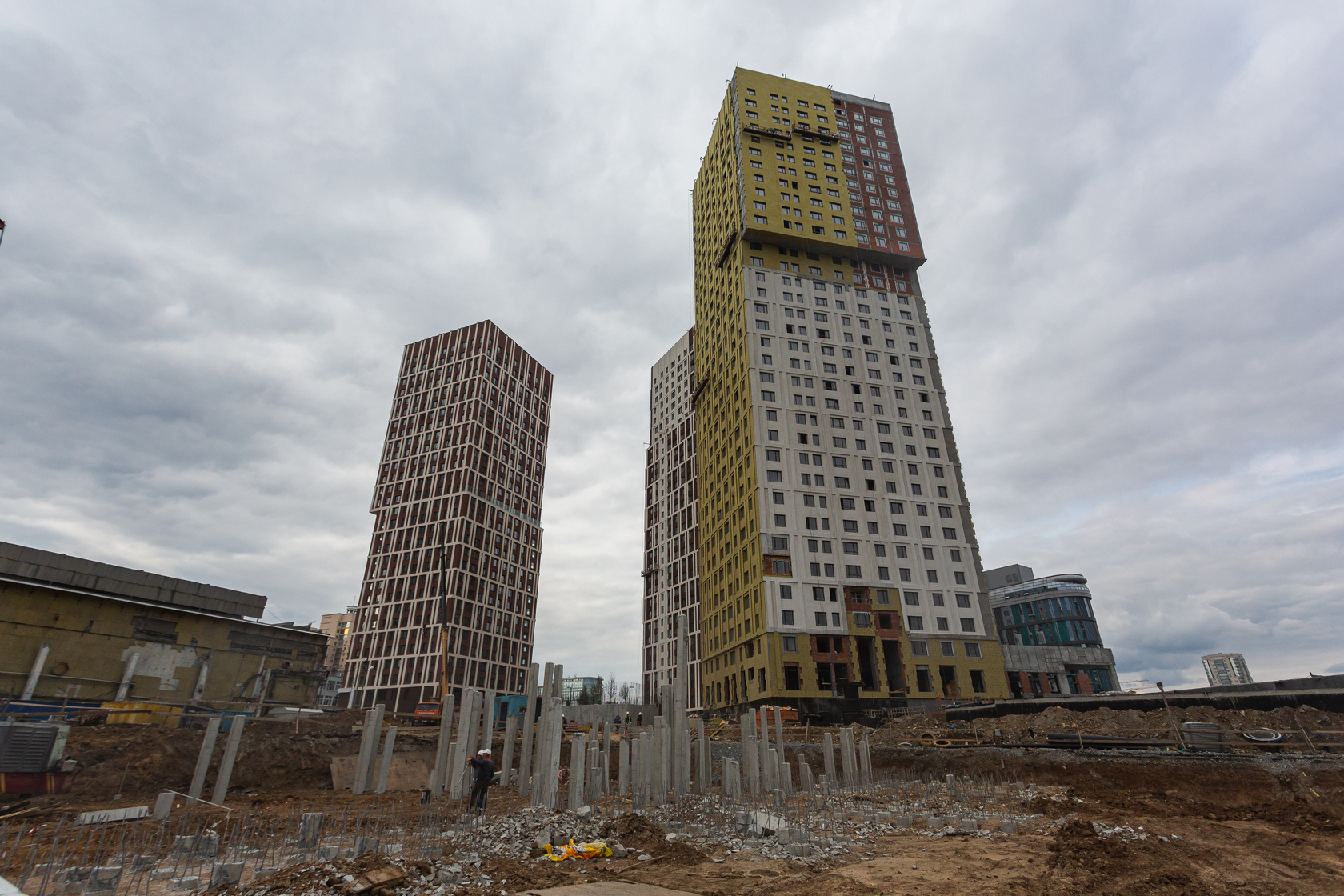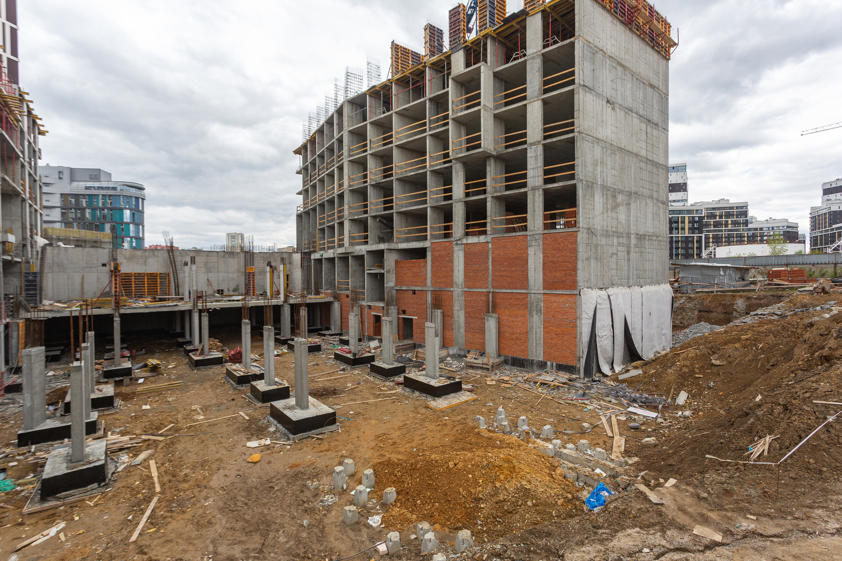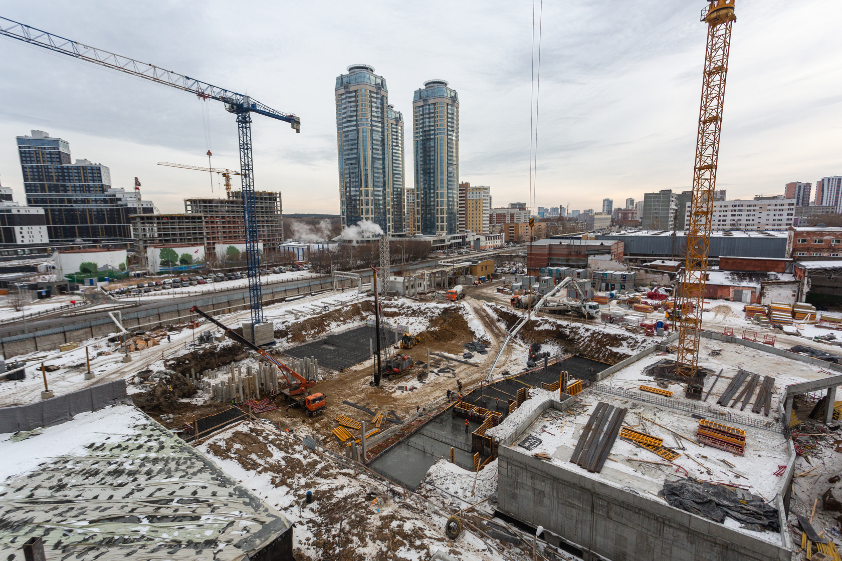 Возводим монолитные конструкции 16 этажа первого дома. Выполняем кирпичную кладку стен на 11–13 этажах. Возводим монолитные конструкции стен подземной части дома и паркинга. Выполнили котлован третьего жилого дома. Забиваем сваи третьего дома.