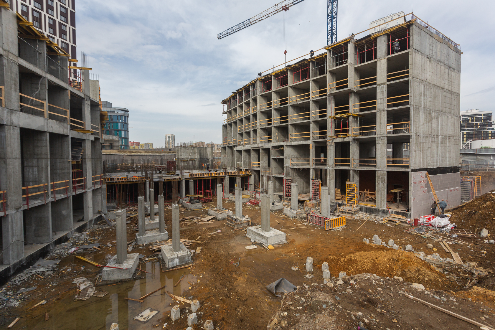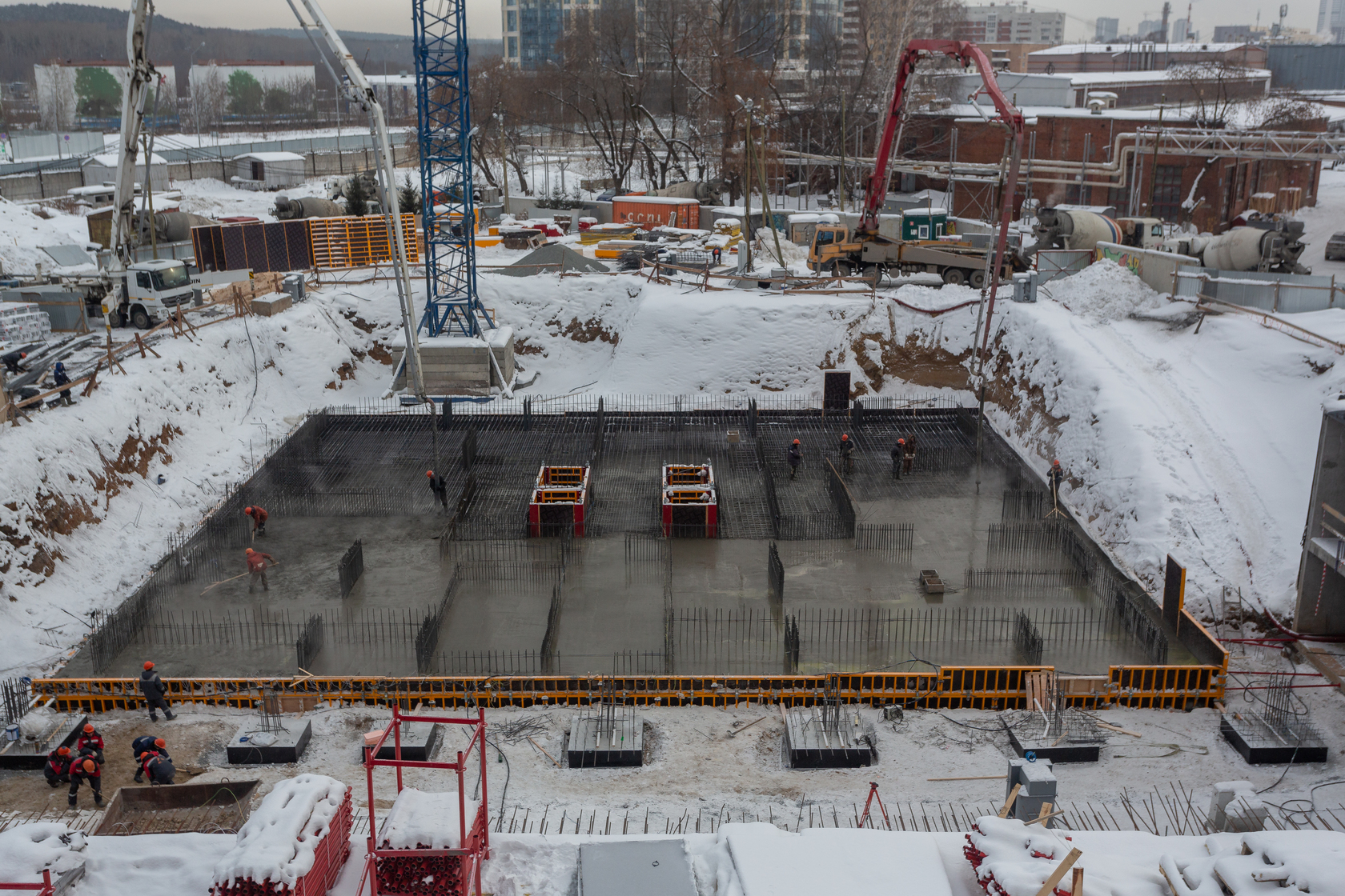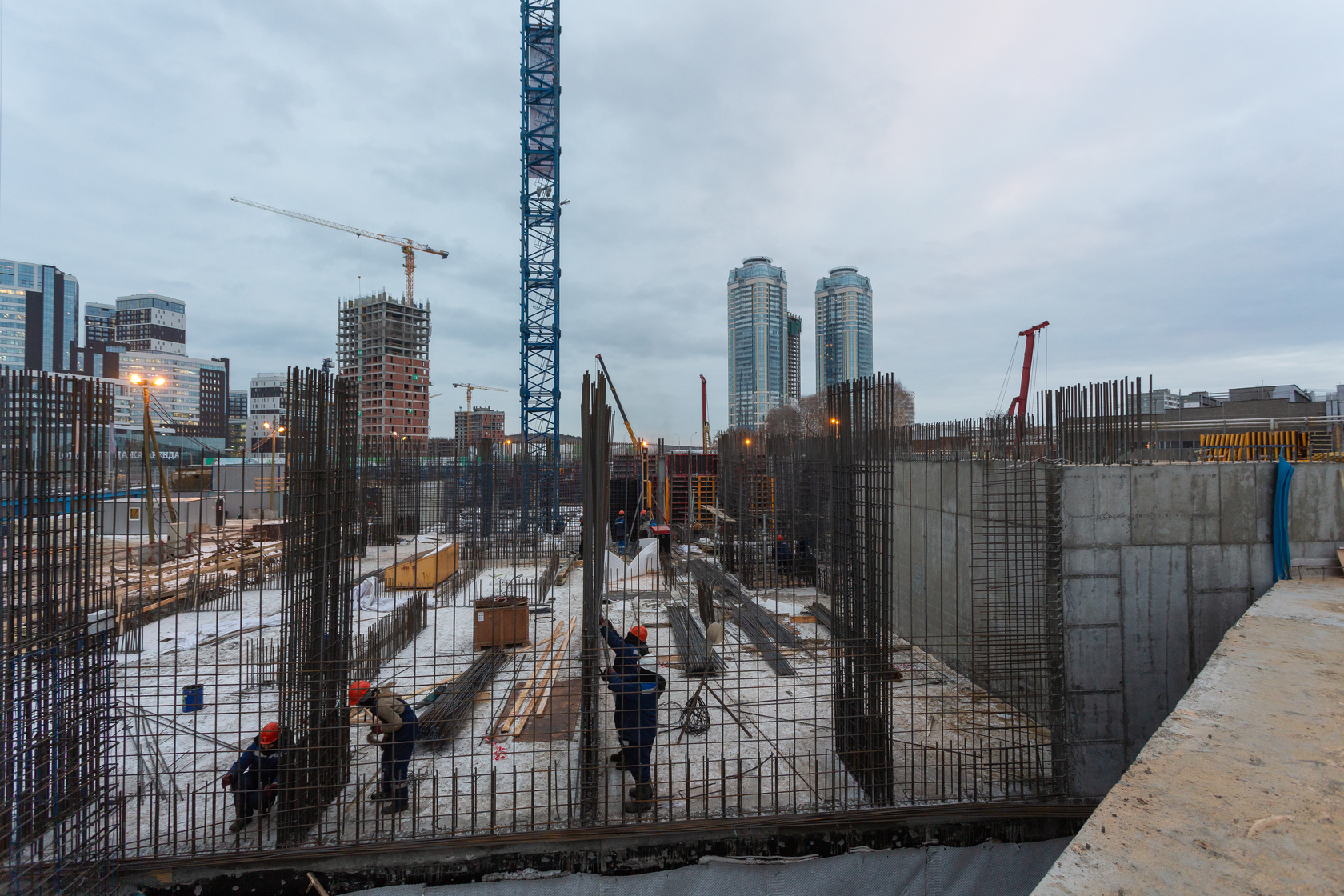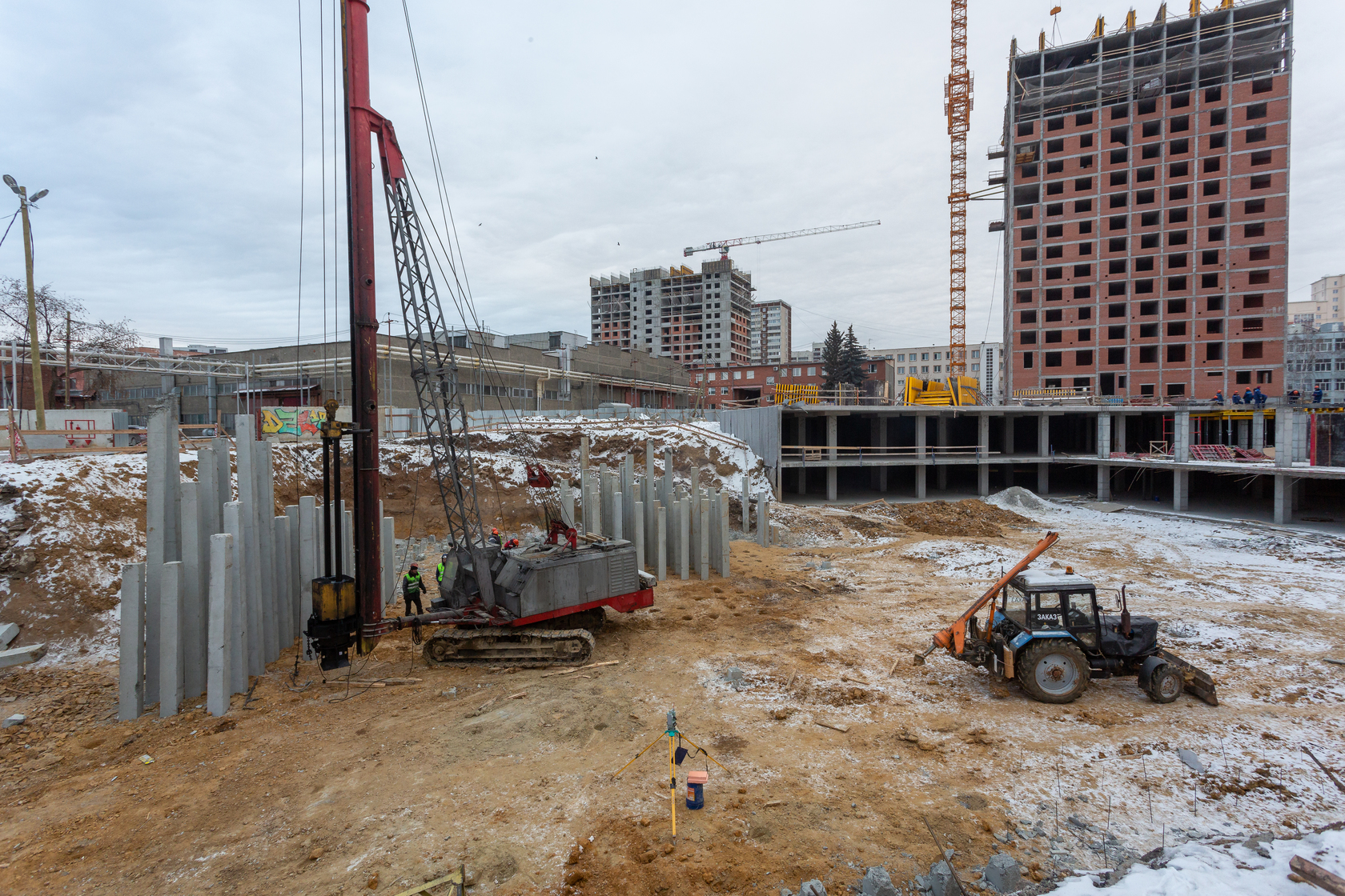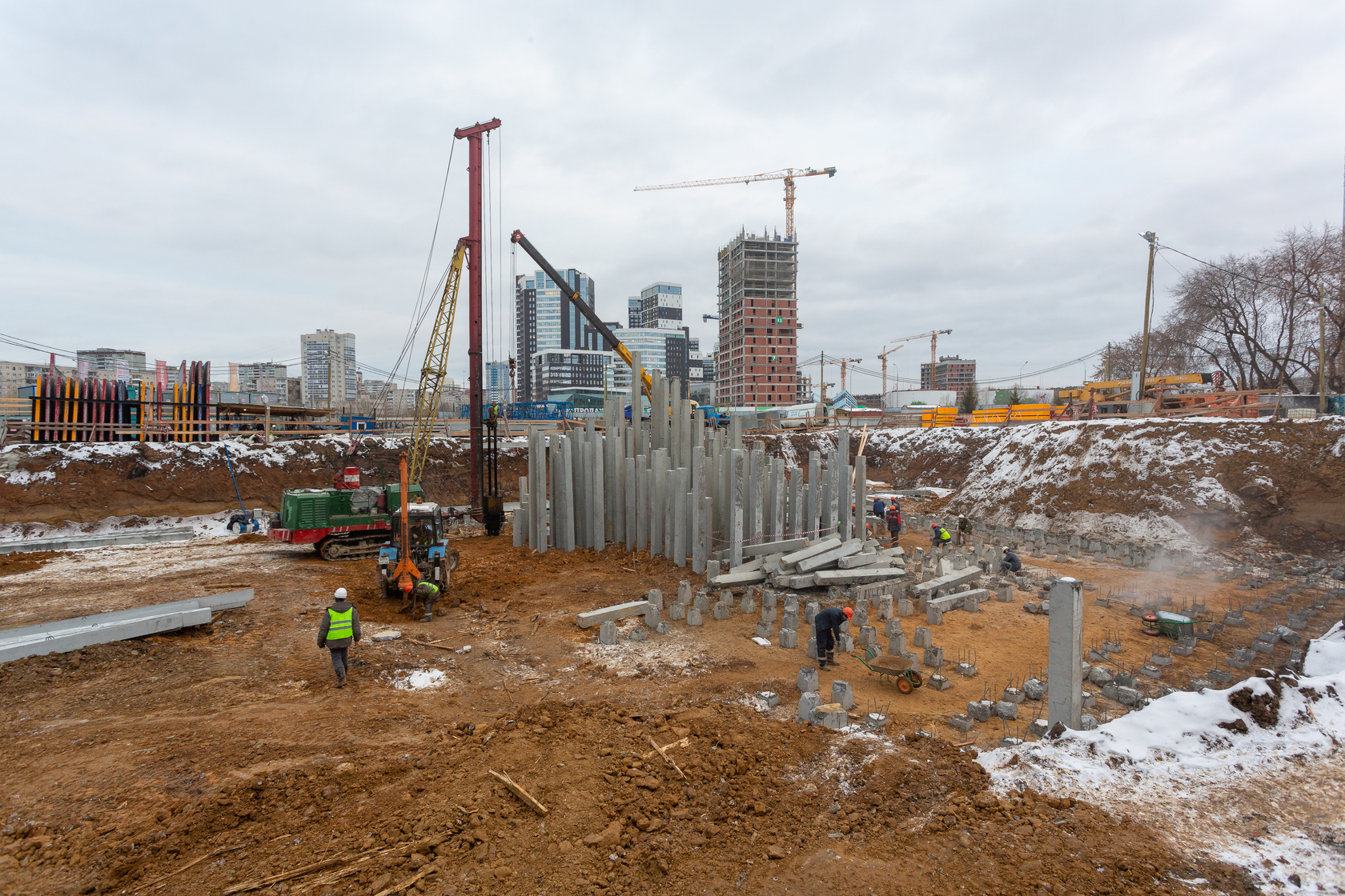 Возводим монолитные конструкции 16 этажа первого дома. Выполняем кирпичную кладку стен на 11–13 этажах. Возводим монолитные конструкции стен подземной части дома и паркинга. Выполнили котлован третьего жилого дома. Забиваем сваи третьего дома.