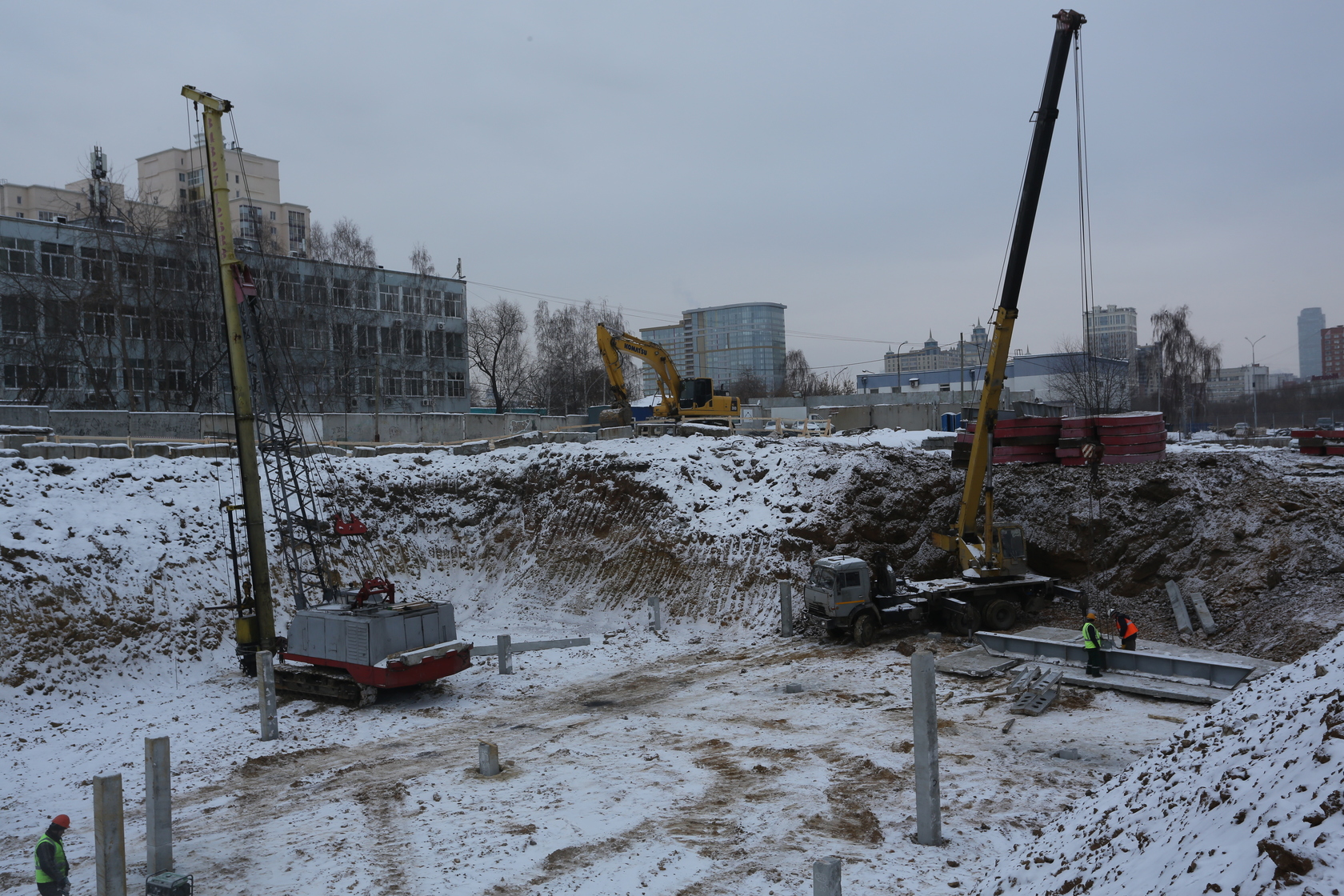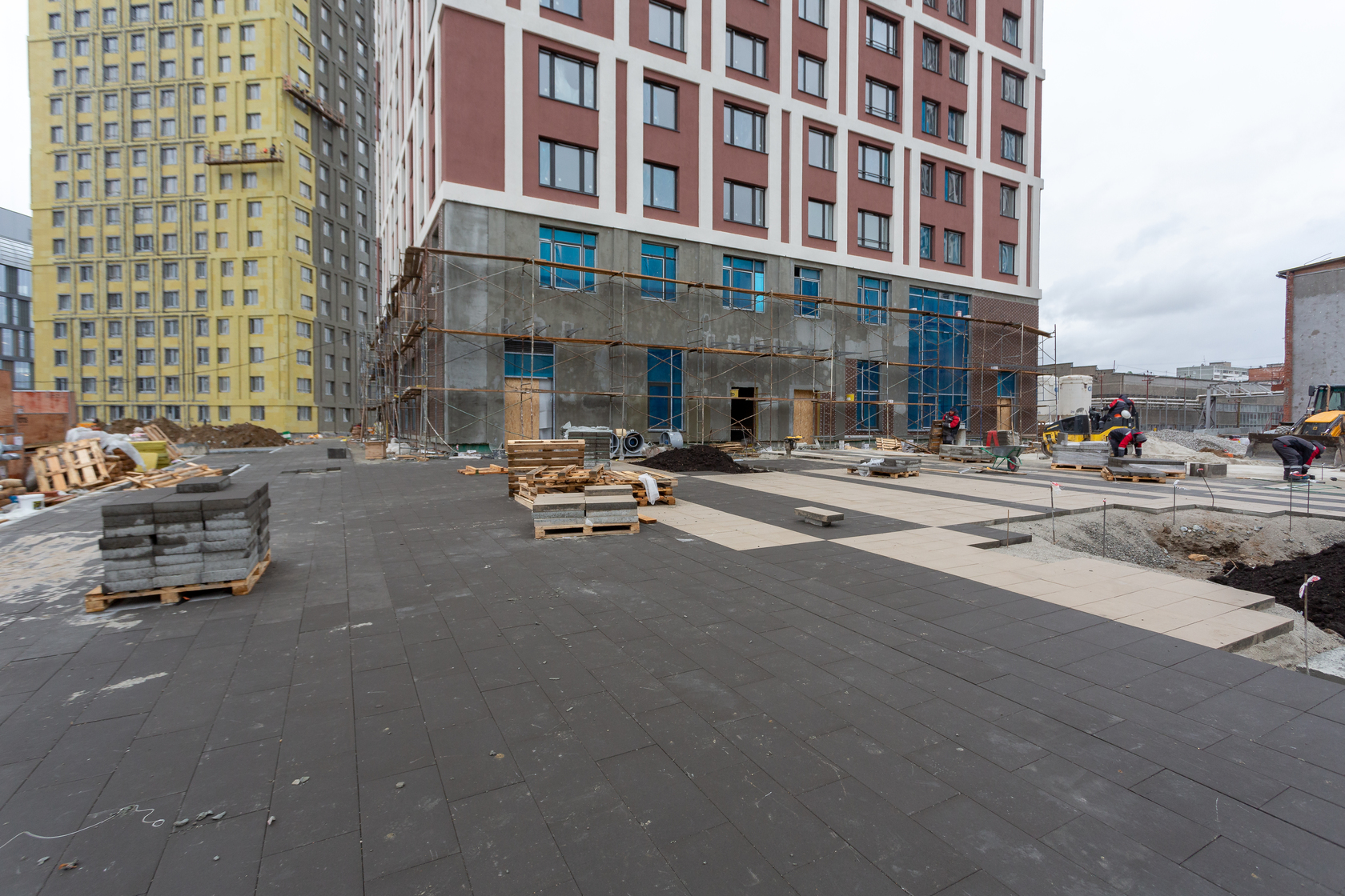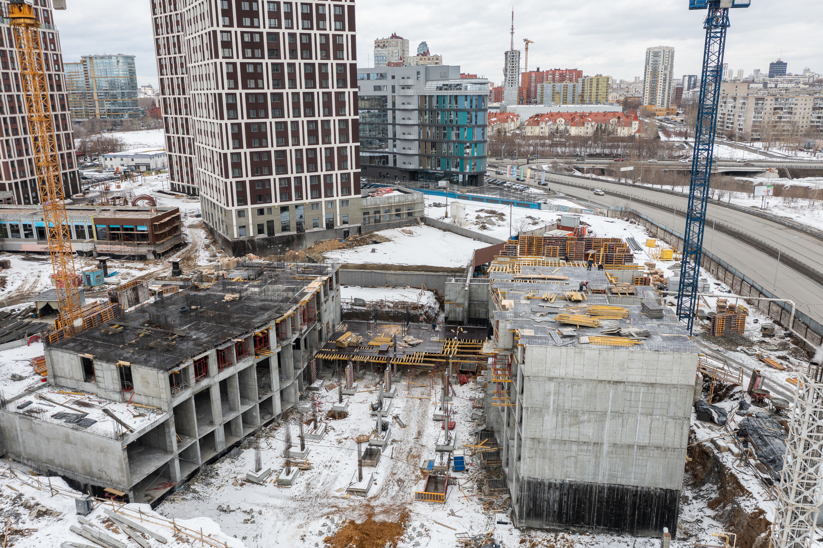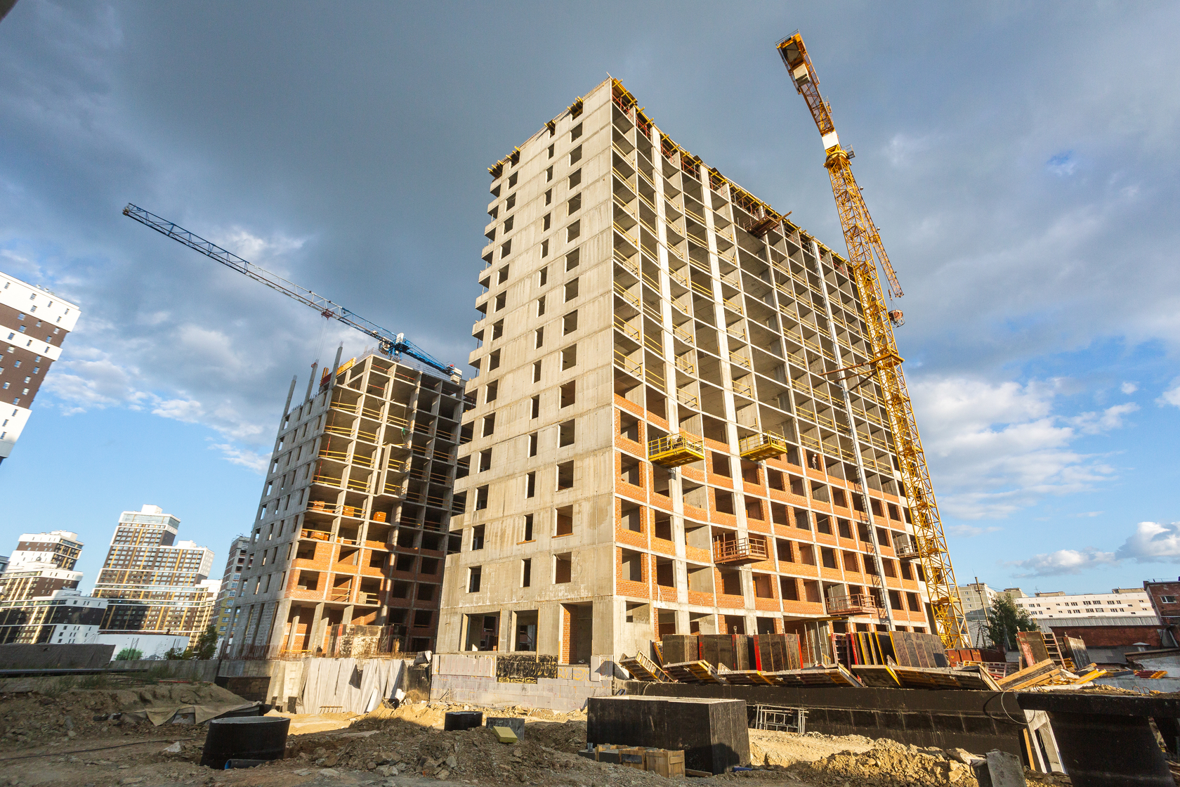 Возводим монолитные конструкции 16 этажа первого дома. Выполняем кирпичную кладку стен на 11–13 этажах. Возводим монолитные конструкции стен подземной части дома и паркинга. Выполнили котлован третьего жилого дома. Забиваем сваи третьего дома.