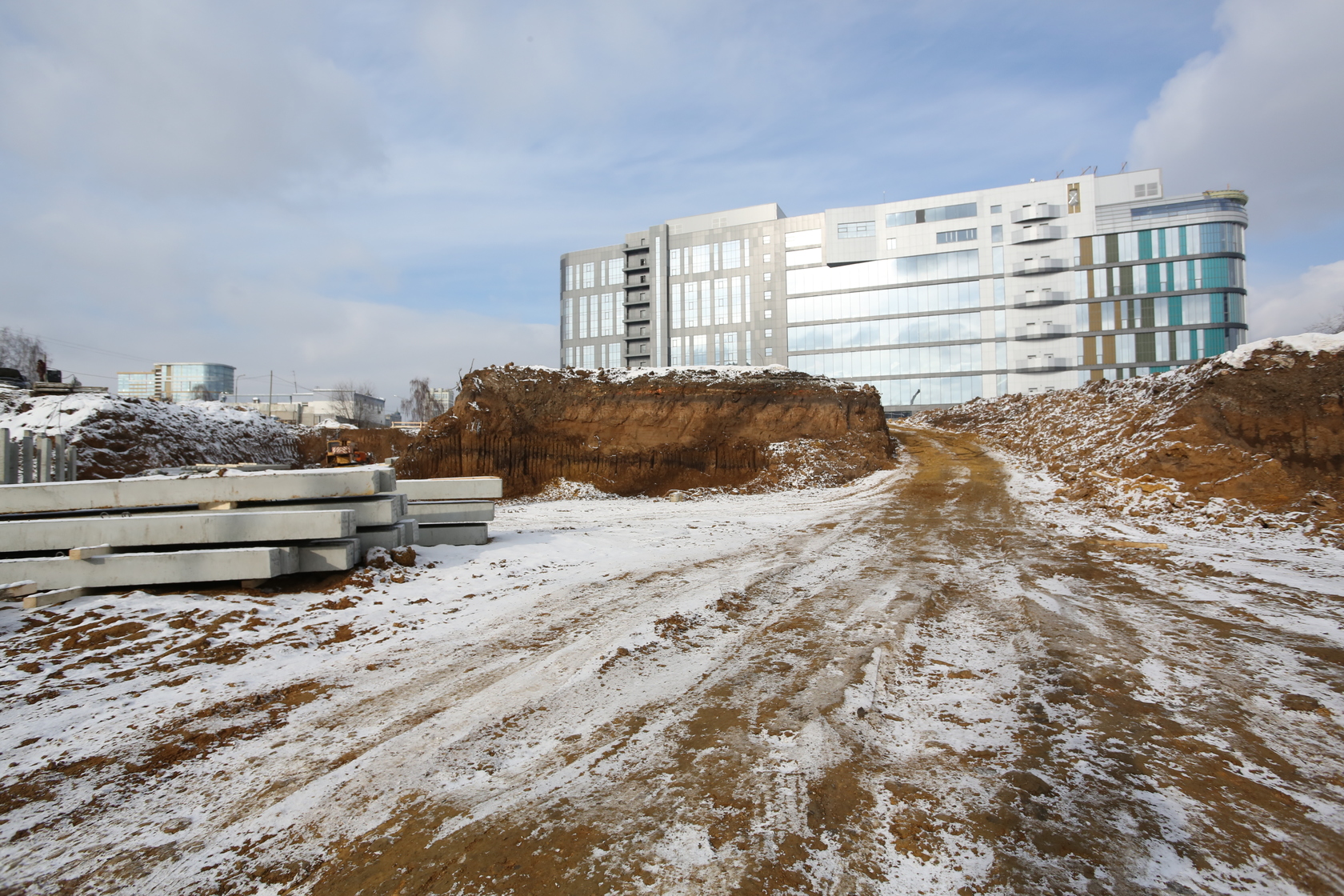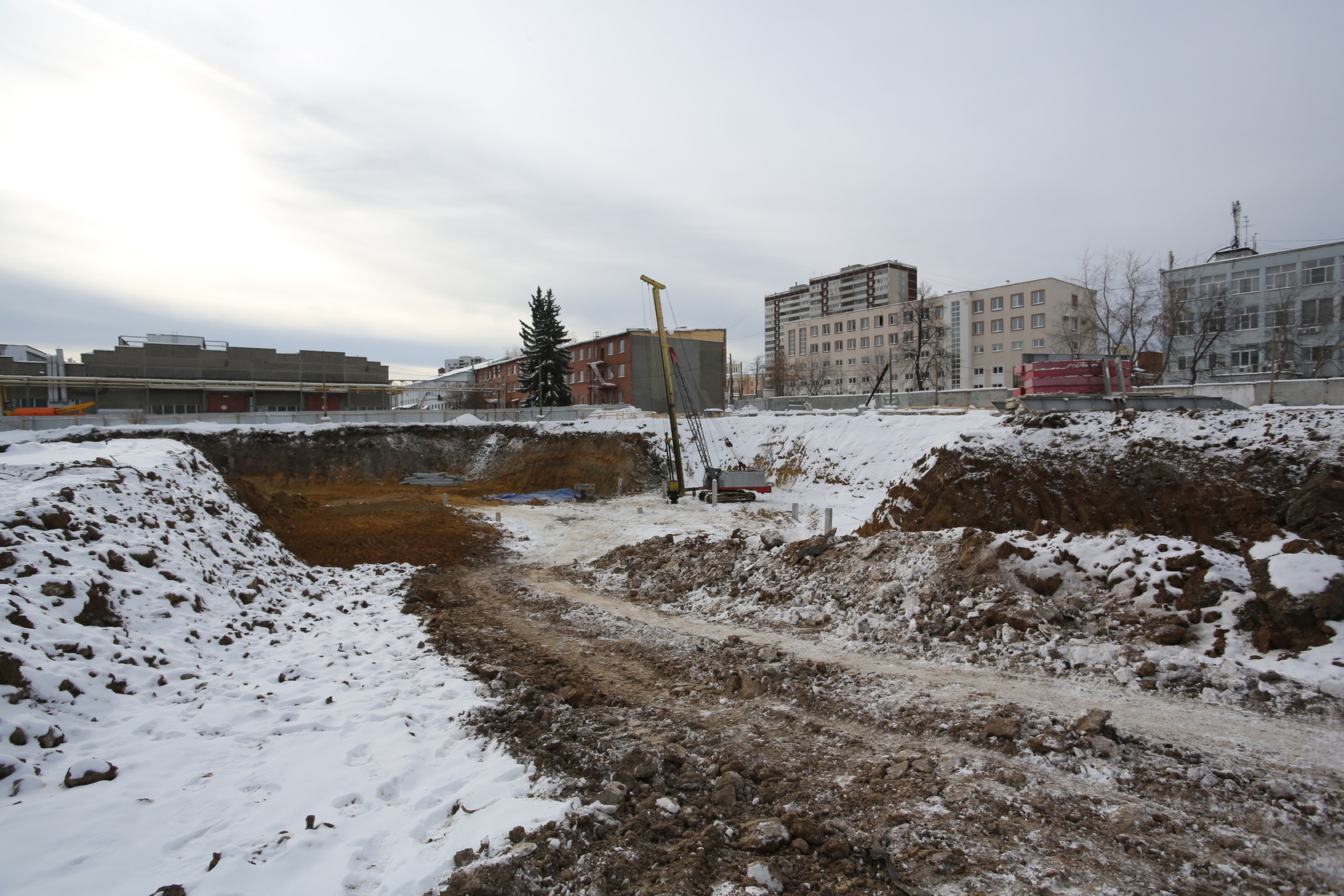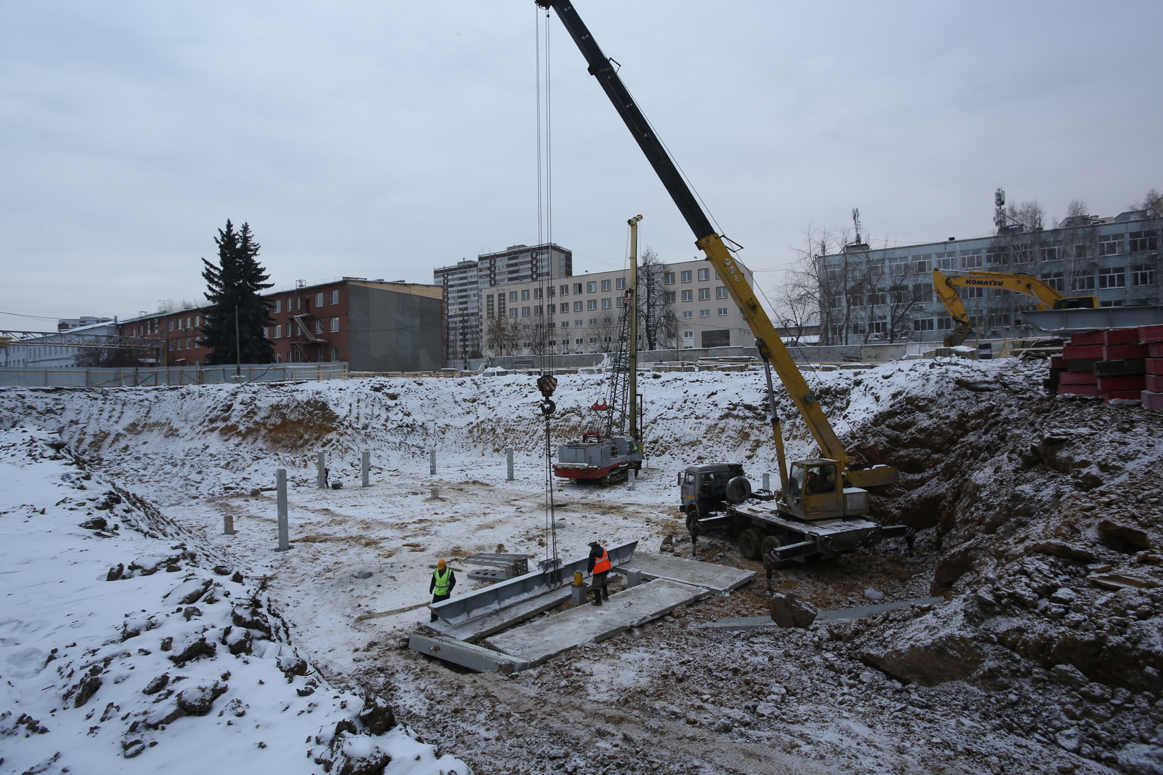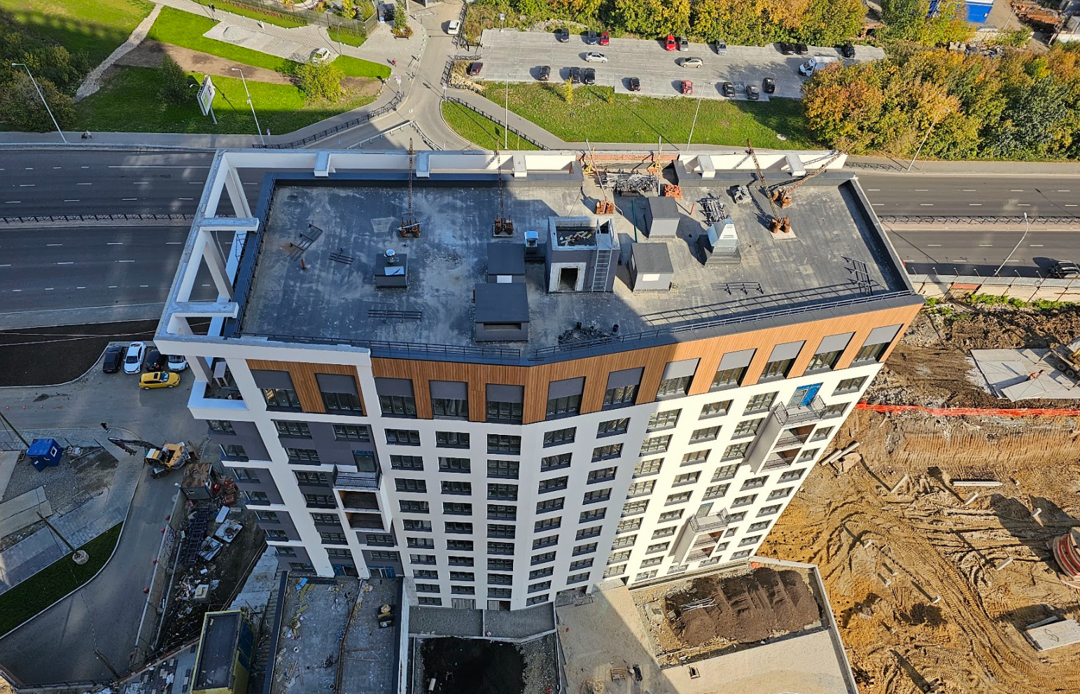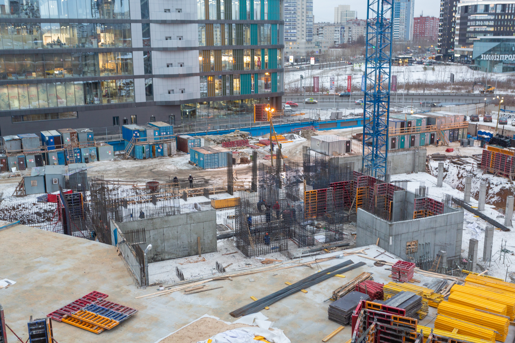 Возводим монолитные конструкции 16 этажа первого дома. Выполняем кирпичную кладку стен на 11–13 этажах. Возводим монолитные конструкции стен подземной части дома и паркинга. Выполнили котлован третьего жилого дома. Забиваем сваи третьего дома.
