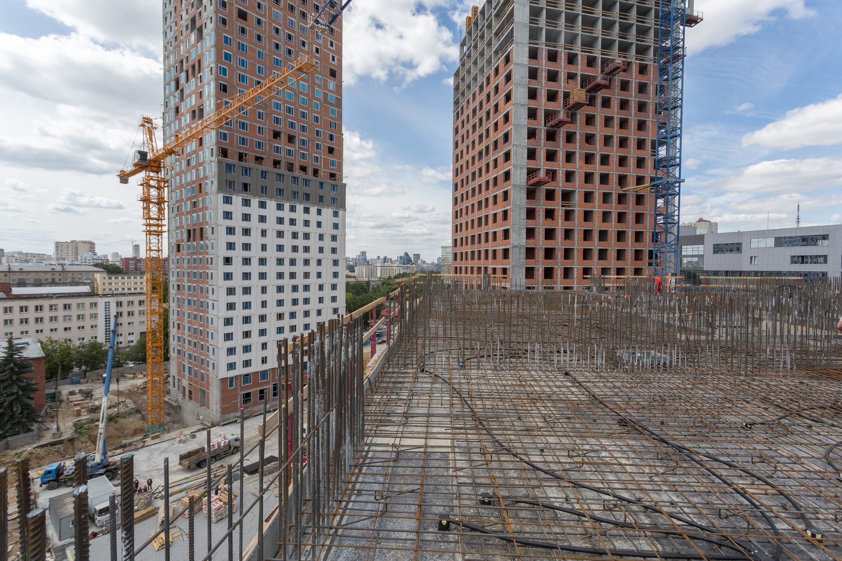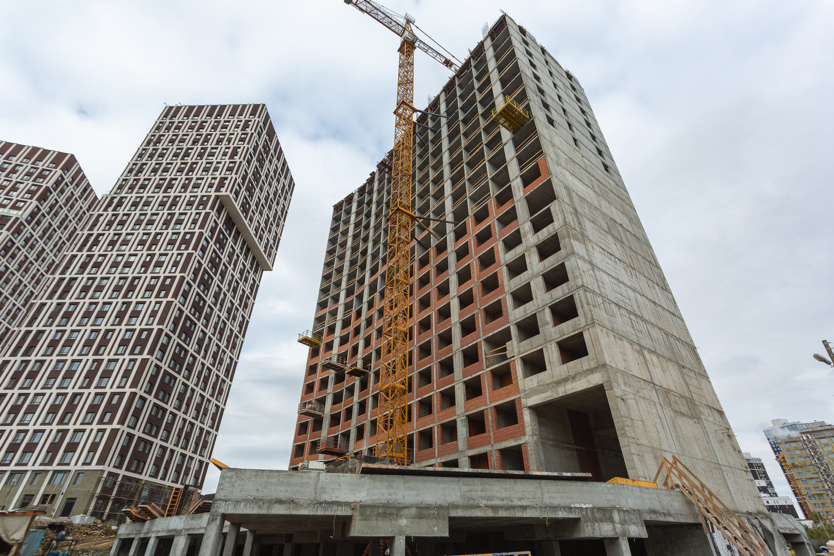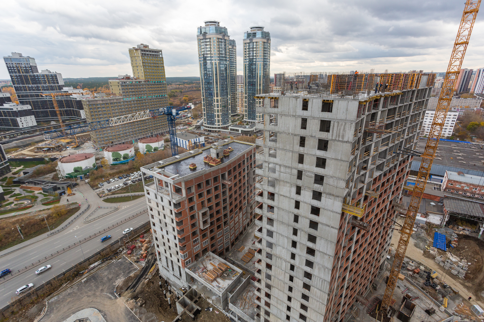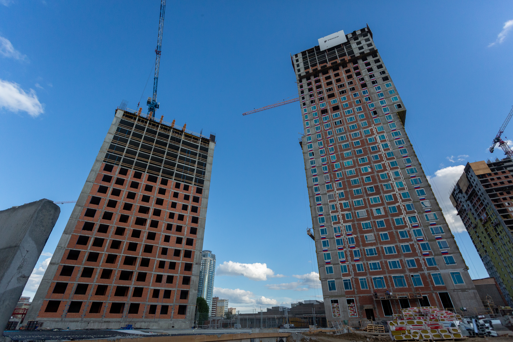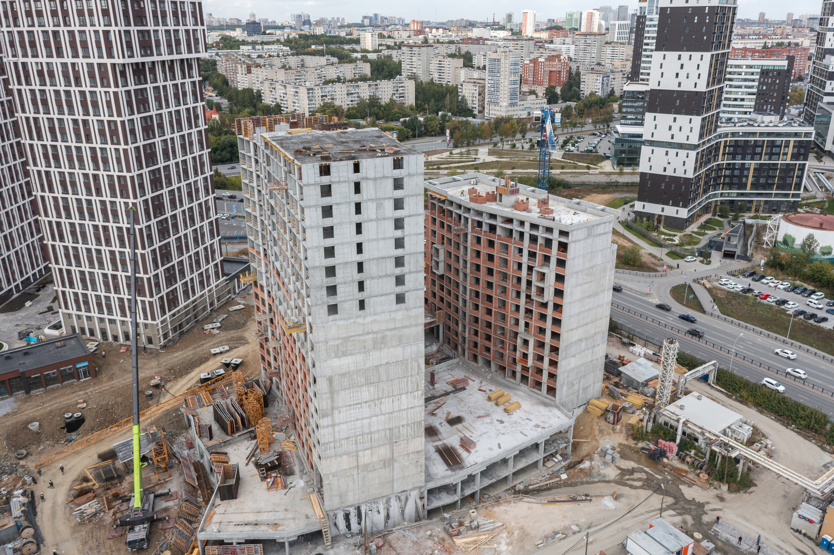 Возводим монолитные конструкции 15 этажа первого дома. Выполняем кирпичную кладку стен на 9–11 этажах.