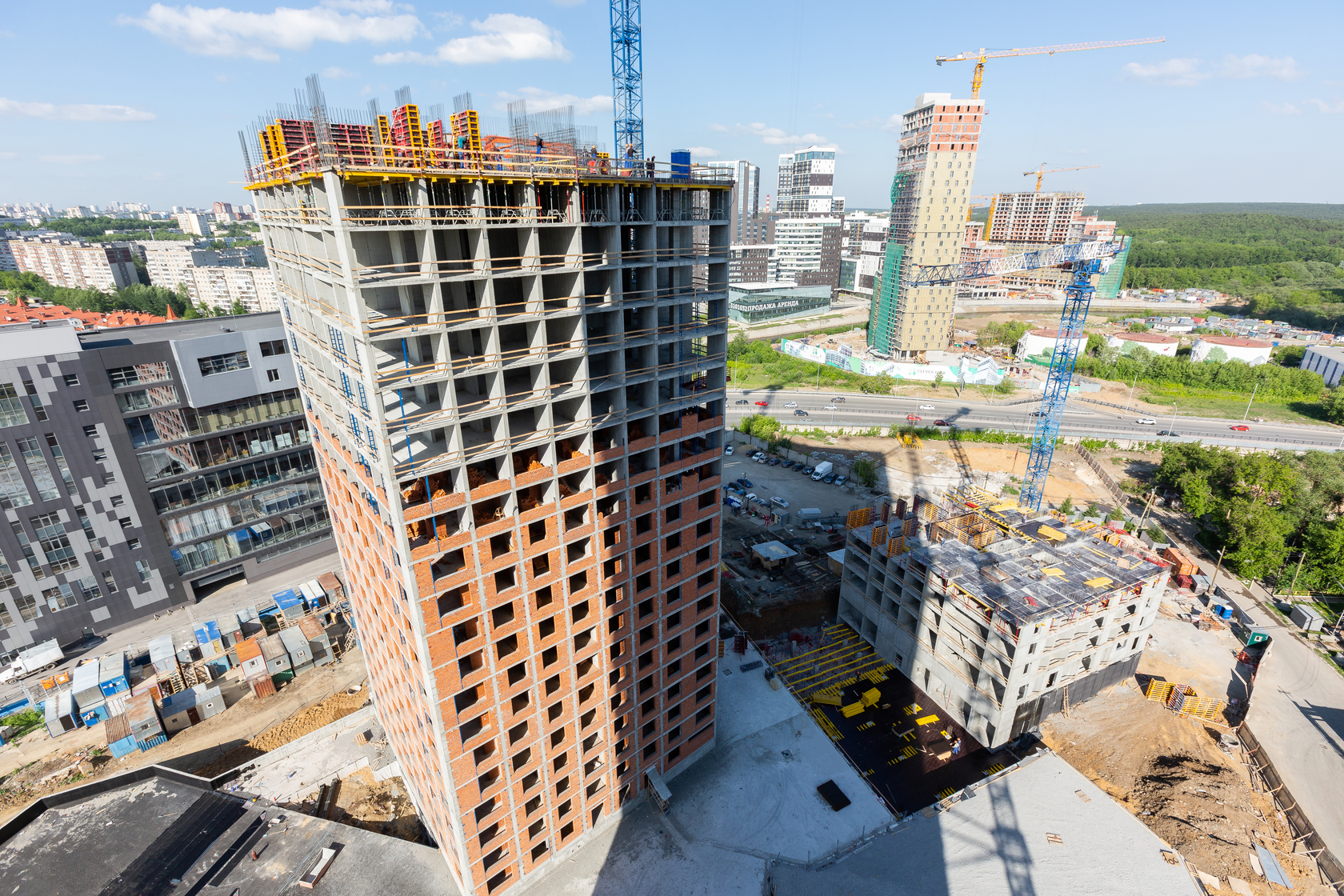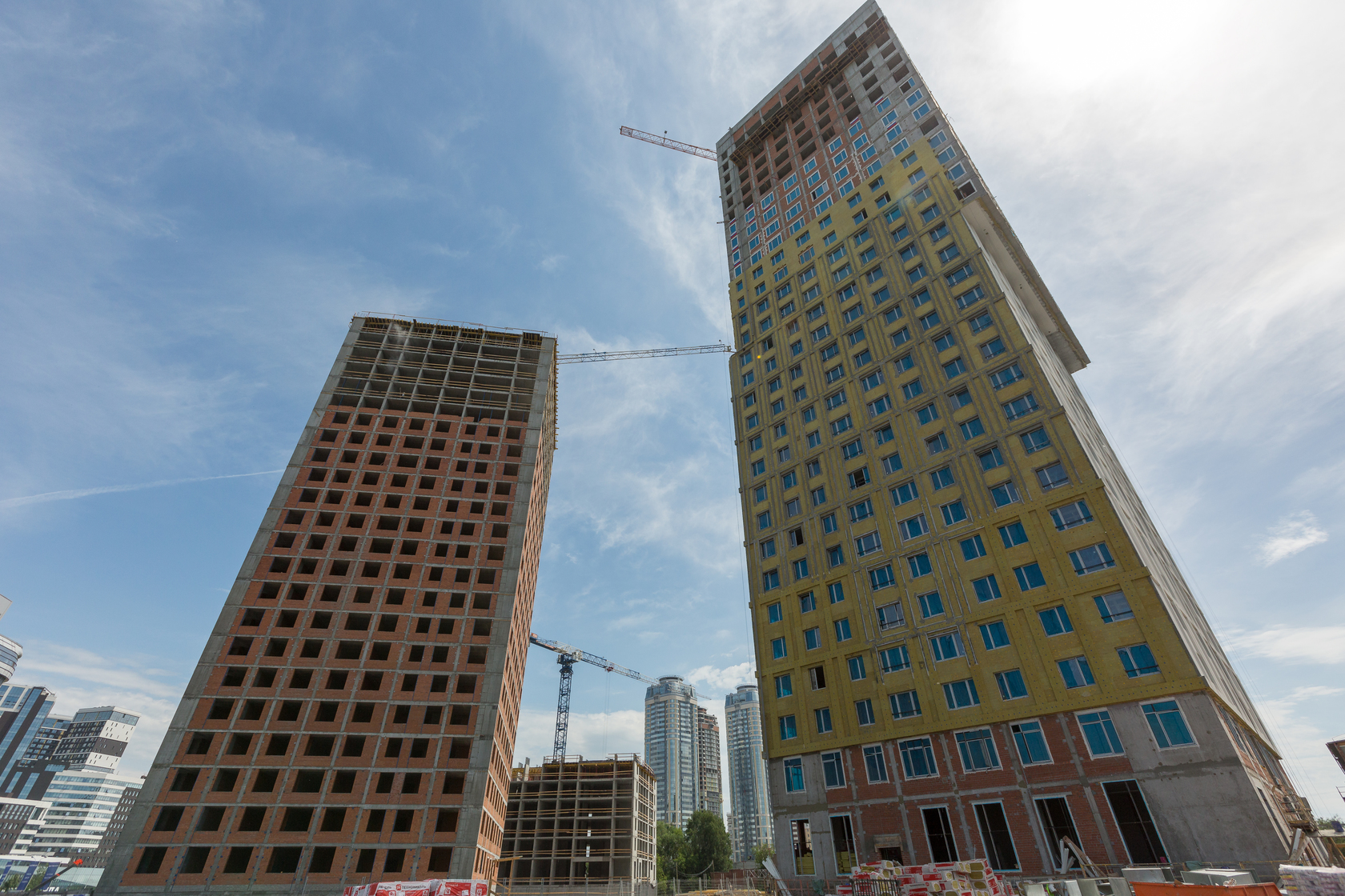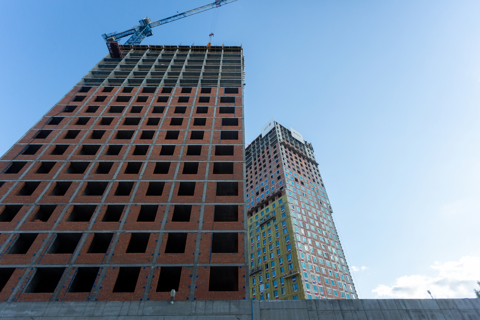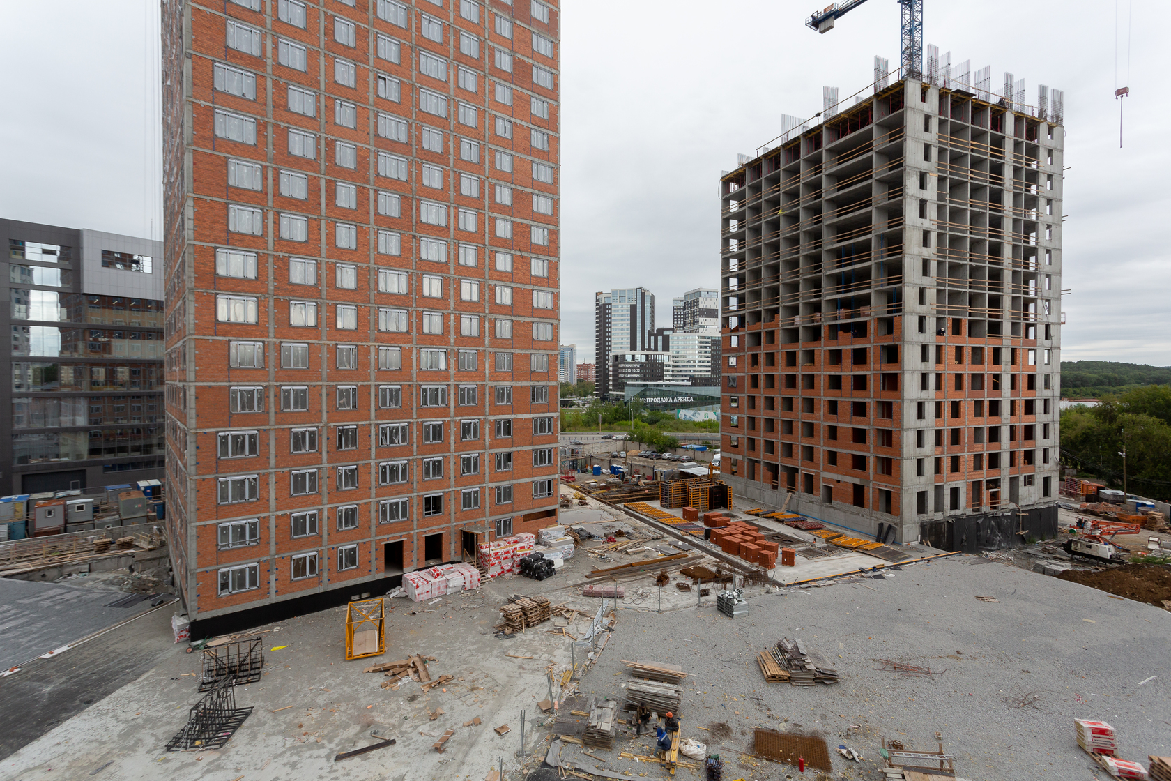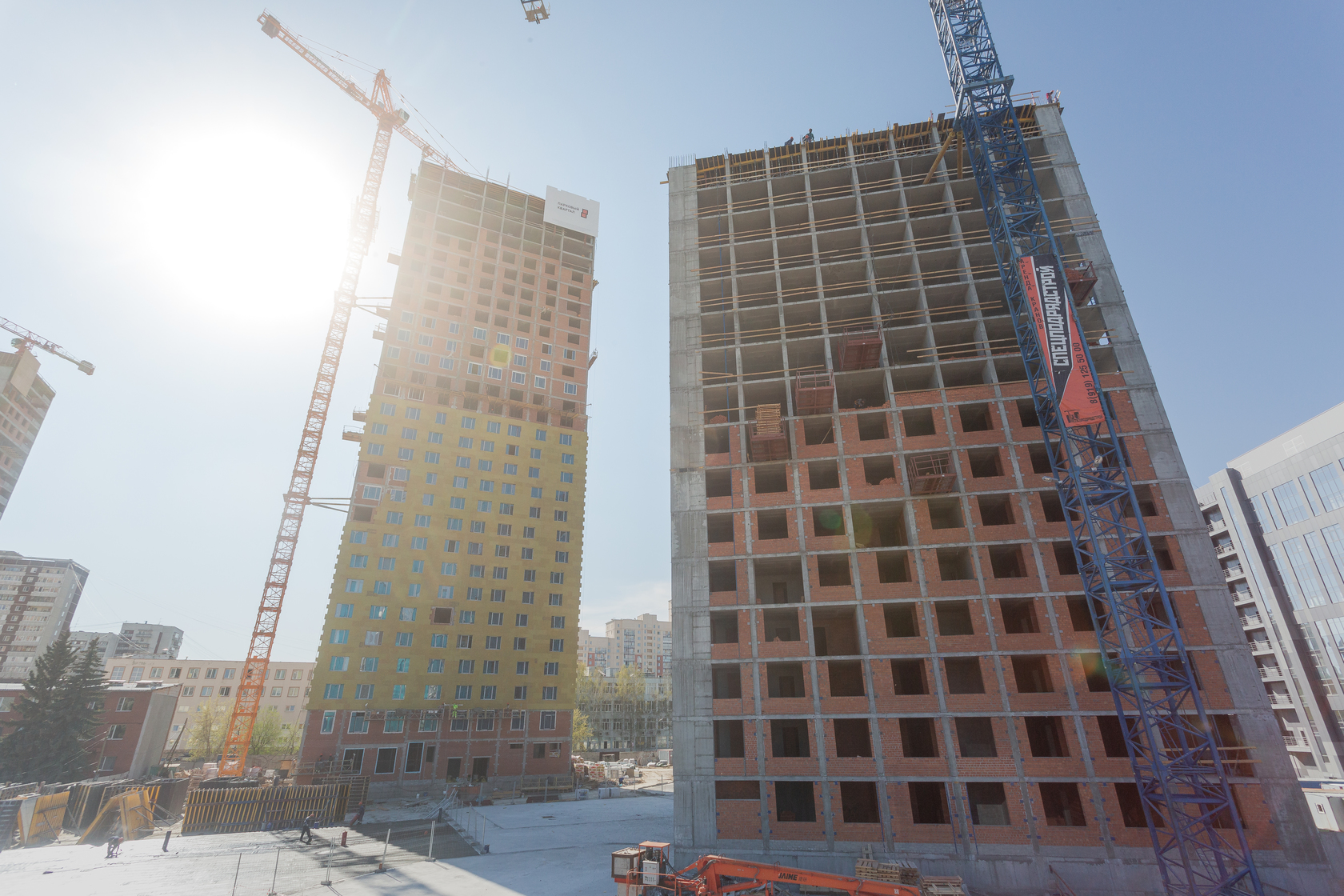 Возводим монолитные конструкции 15 этажа первого дома. Выполняем кирпичную кладку стен на 9–11 этажах.