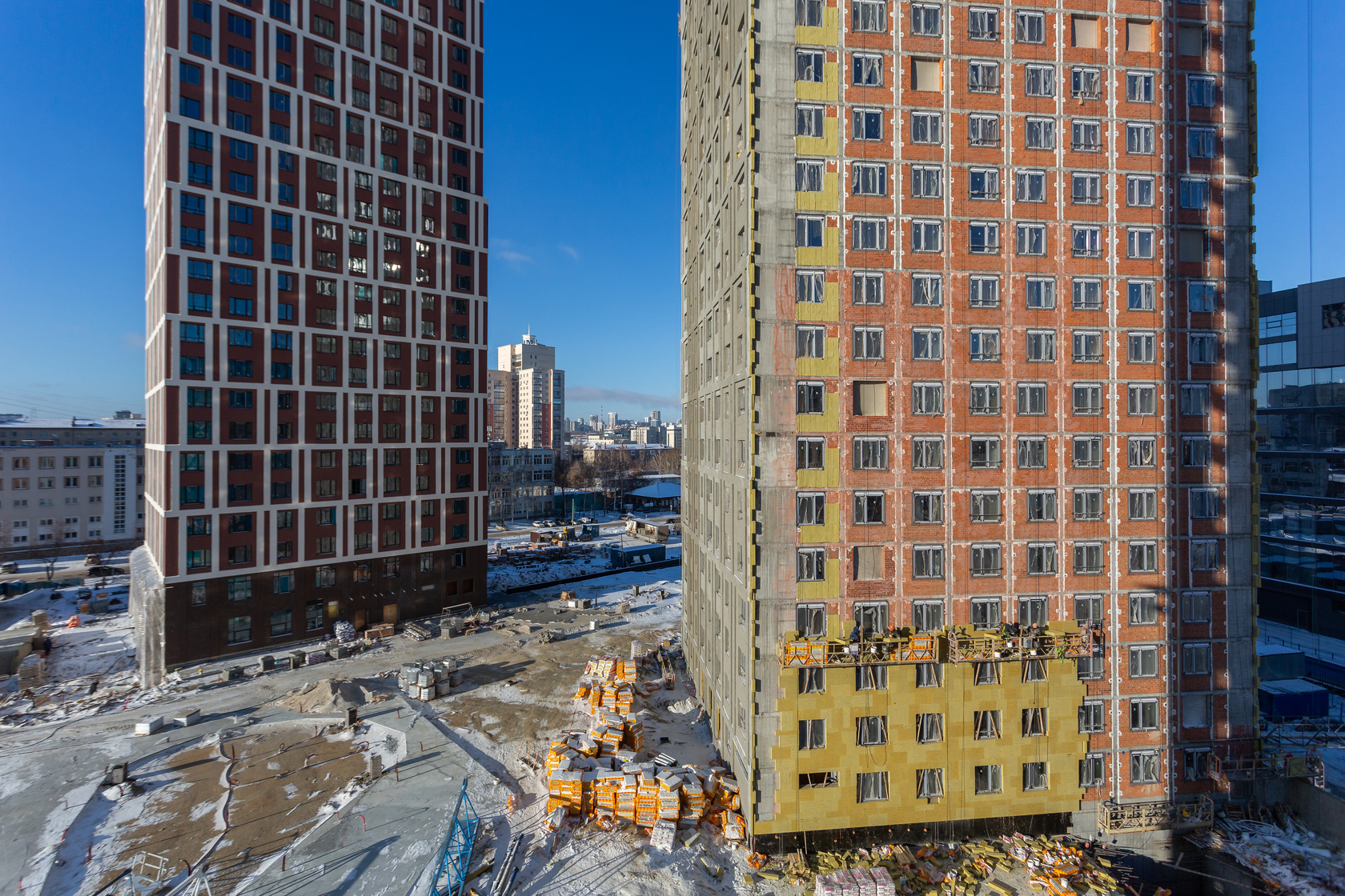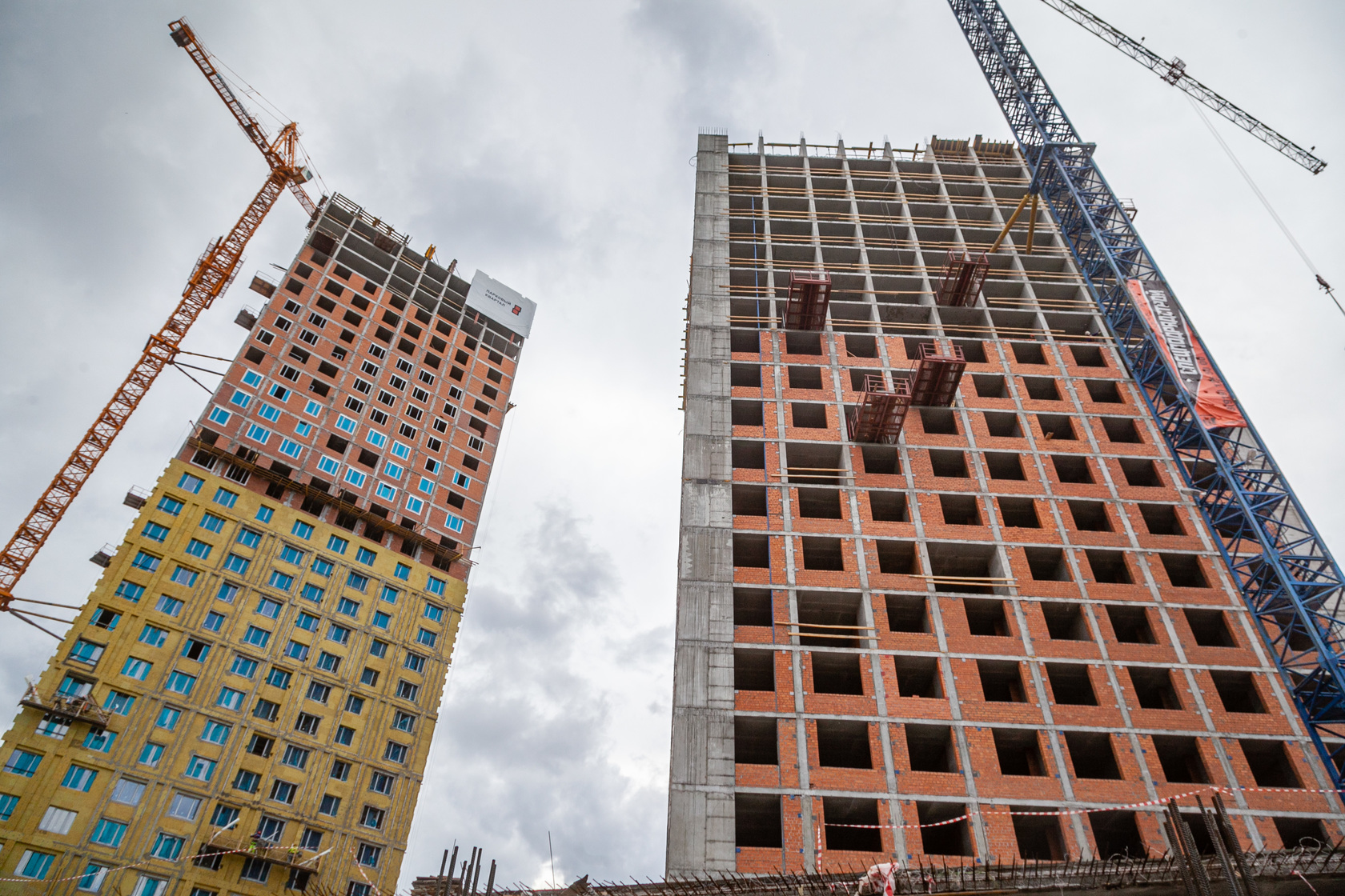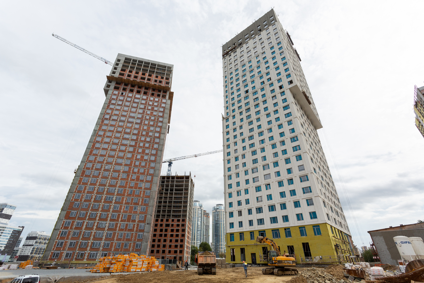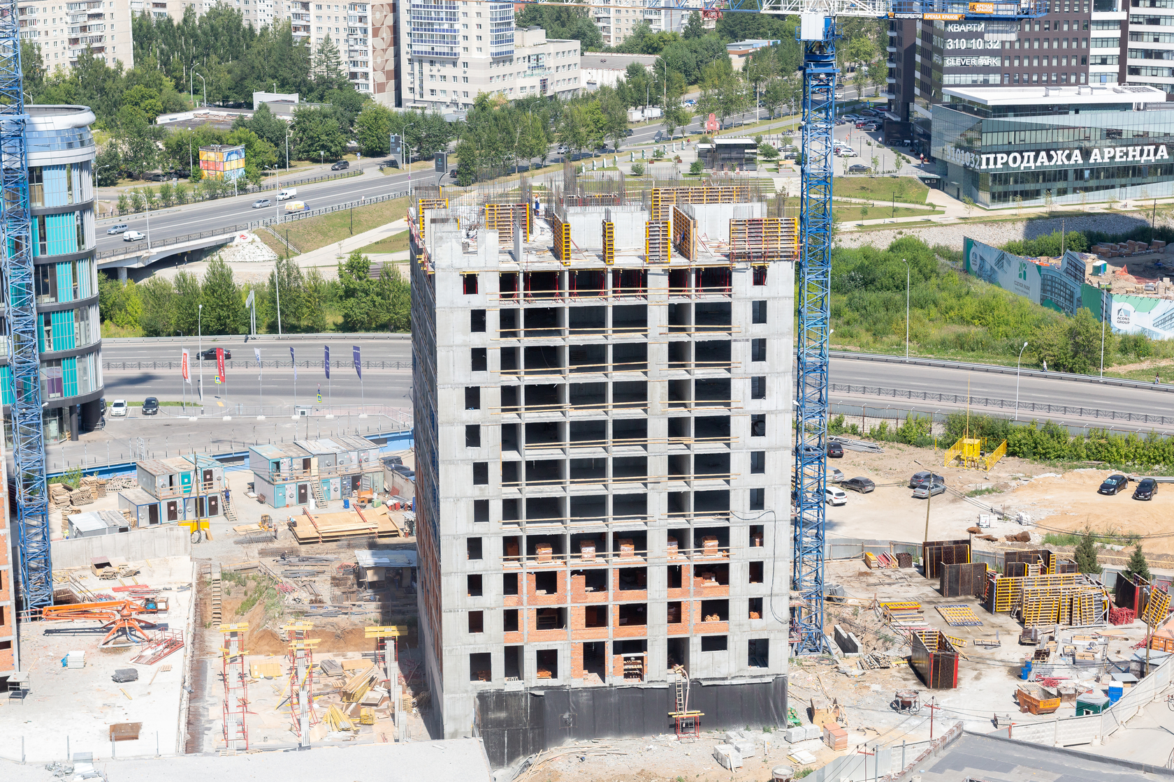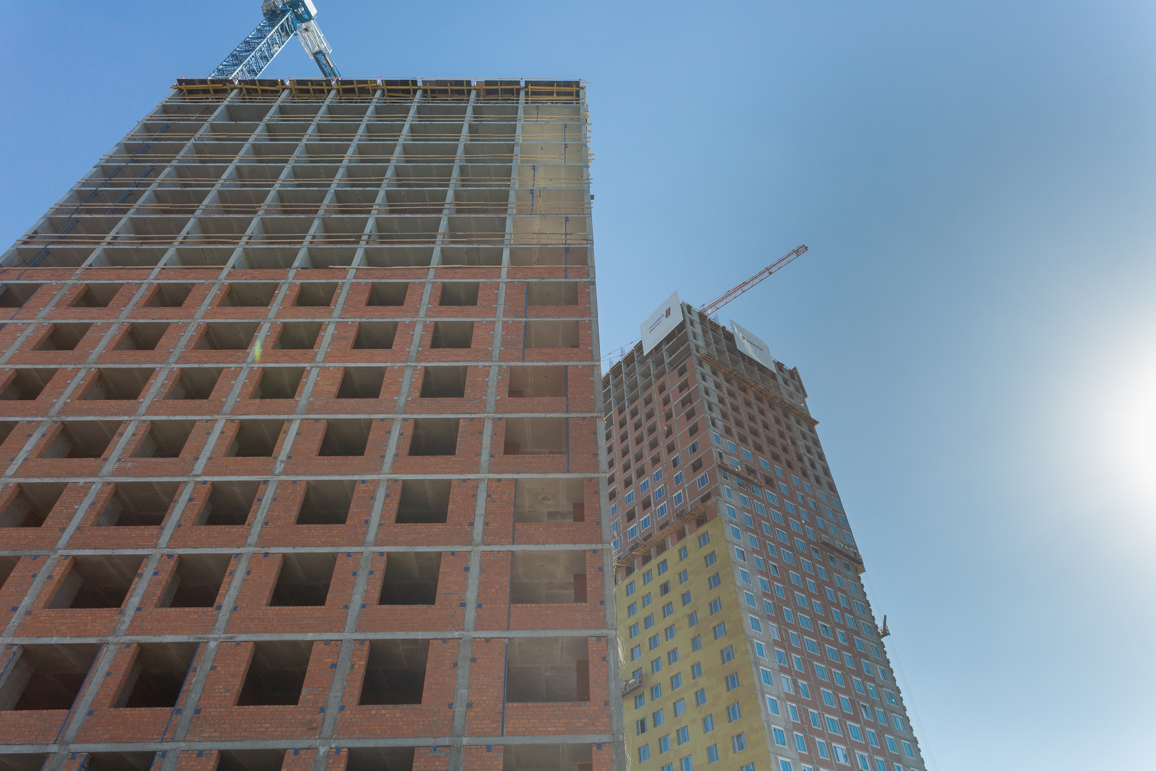 Возводим монолитные конструкции 15 этажа первого дома. Выполняем кирпичную кладку стен на 9–11 этажах.