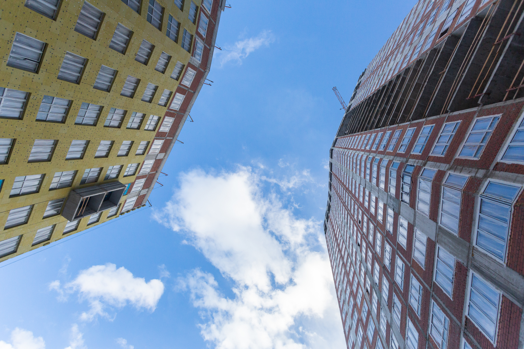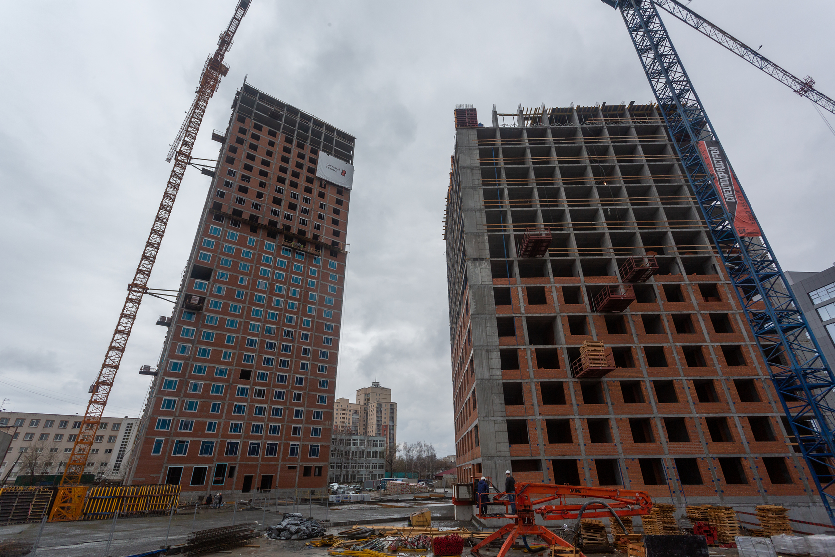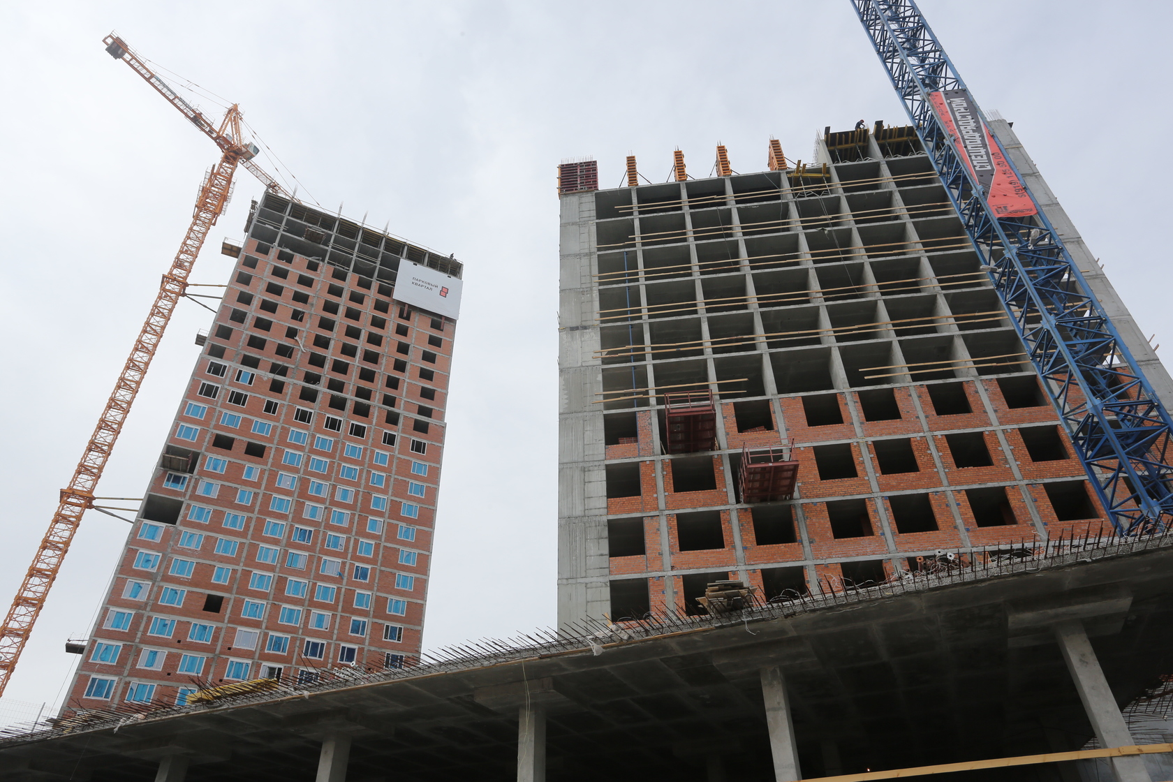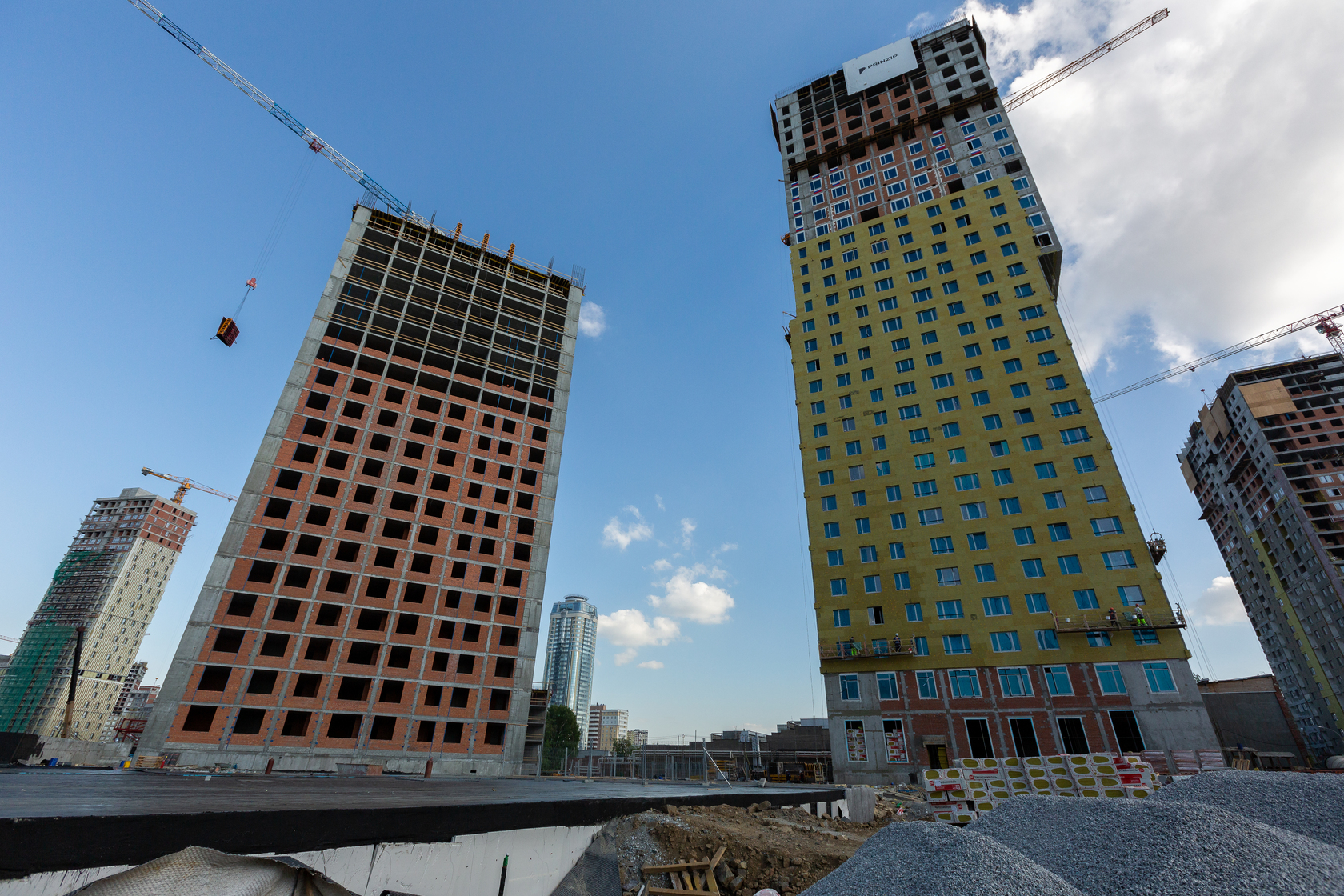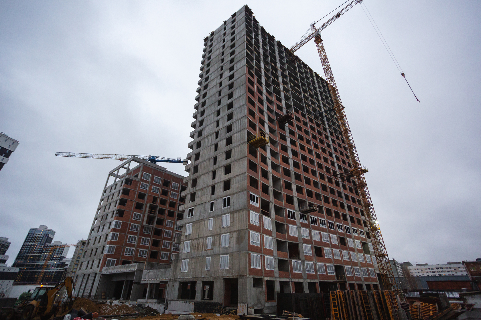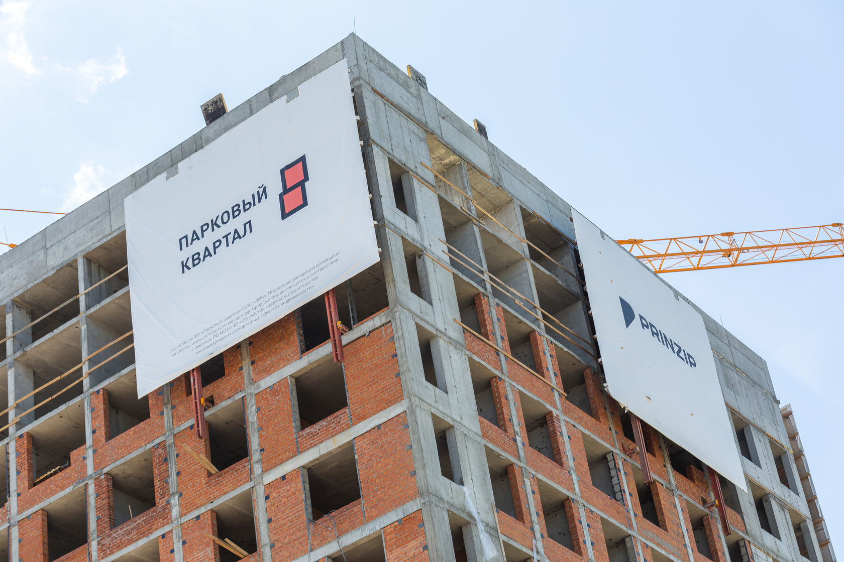 Возводим монолитные конструкции 15 этажа первого дома. Выполняем кирпичную кладку стен на 9–11 этажах.