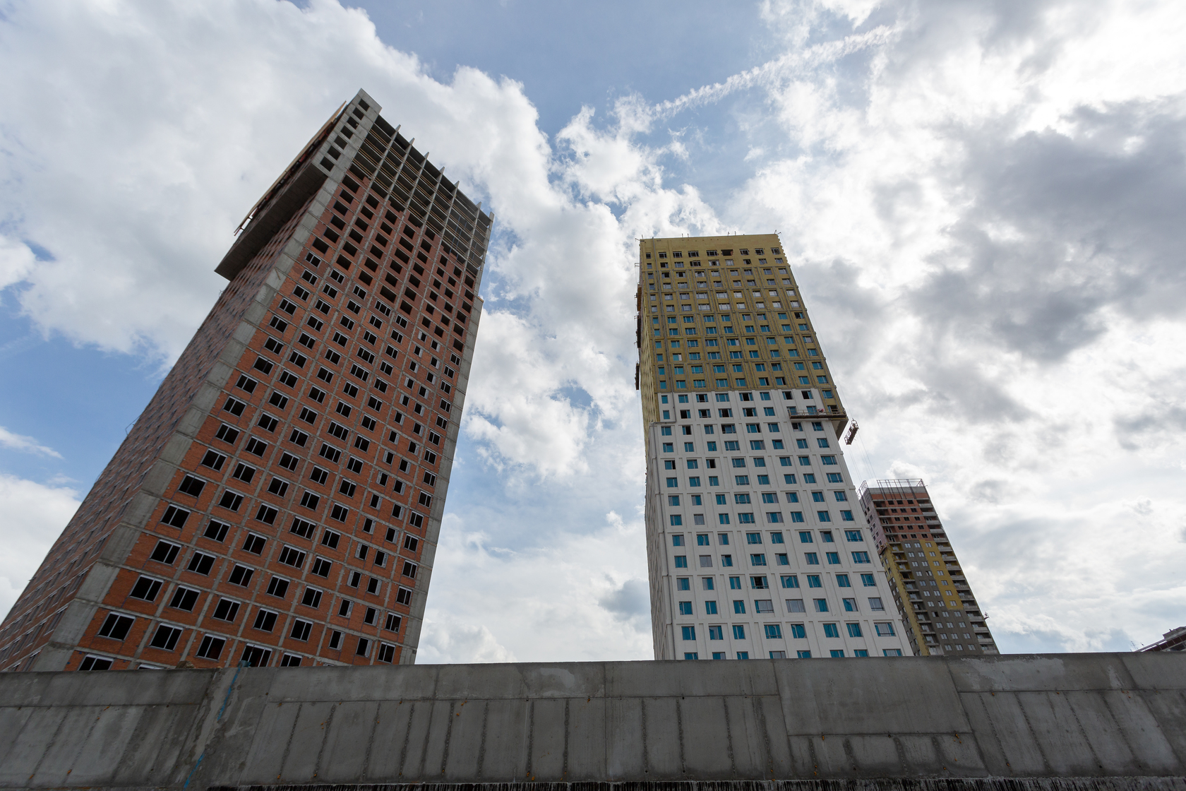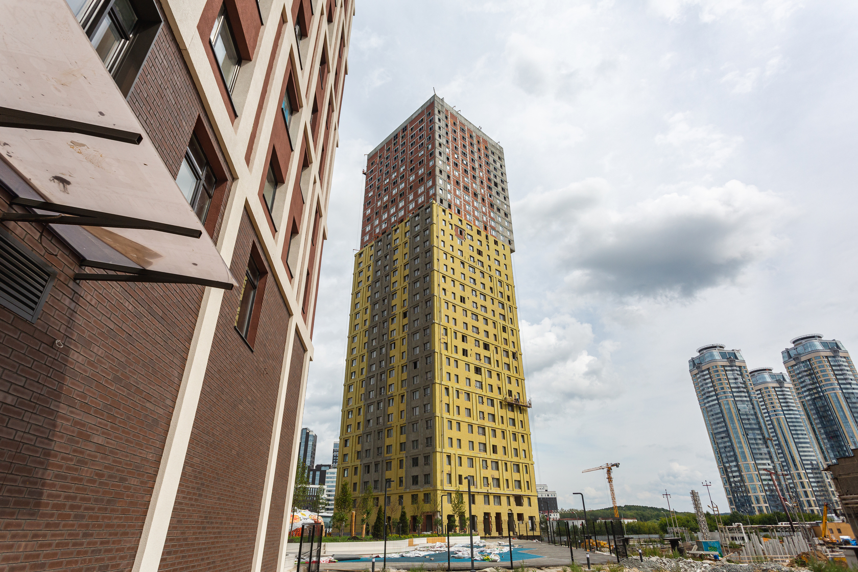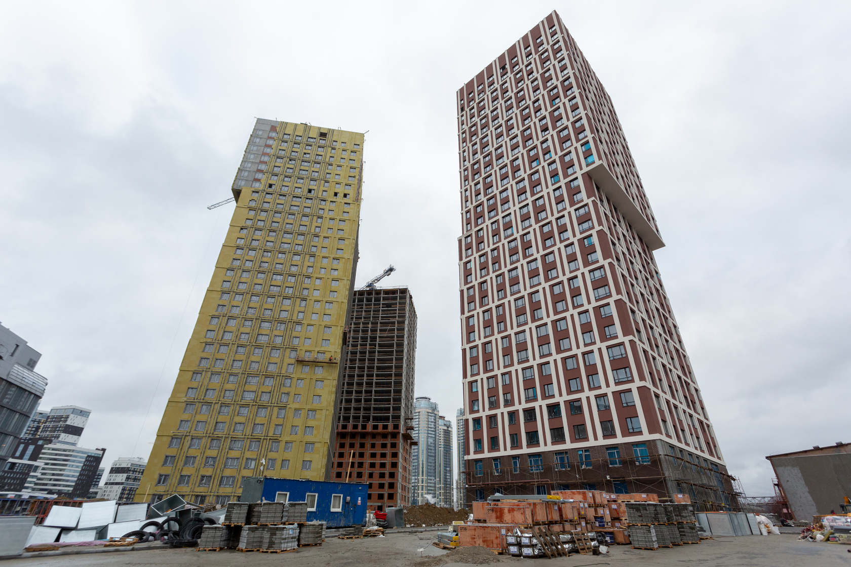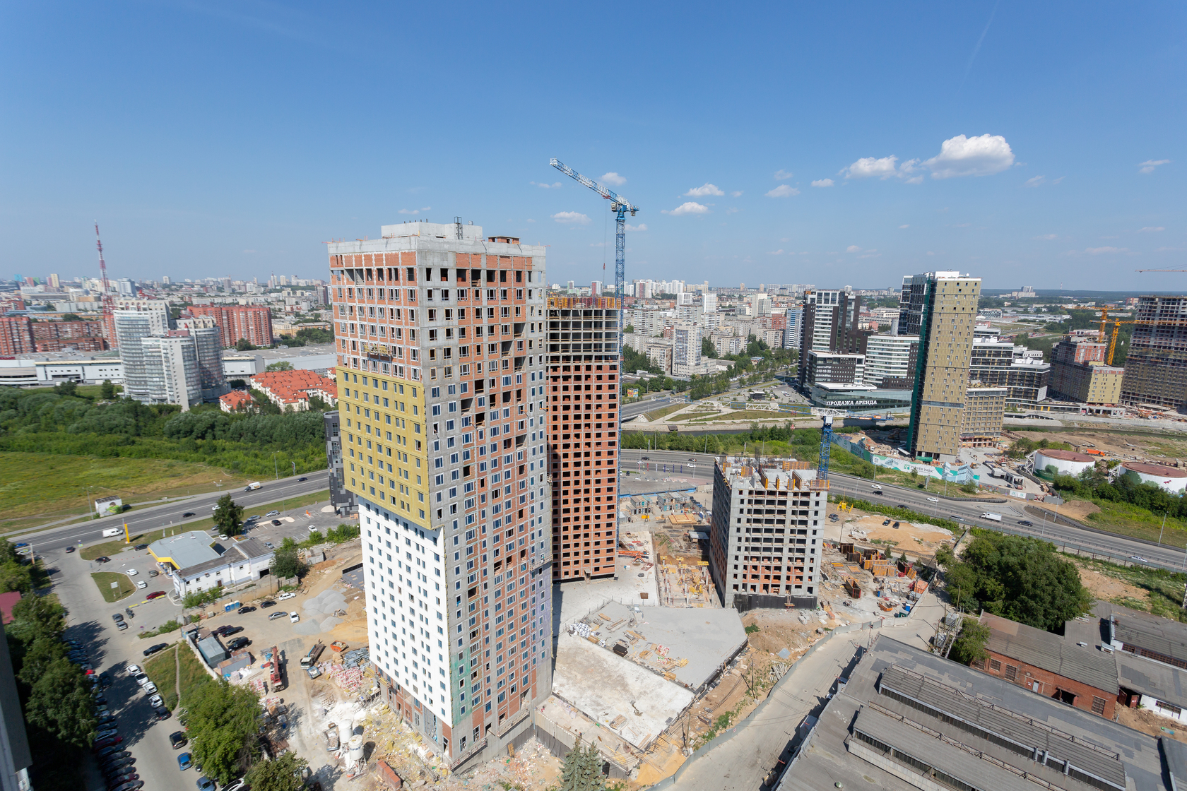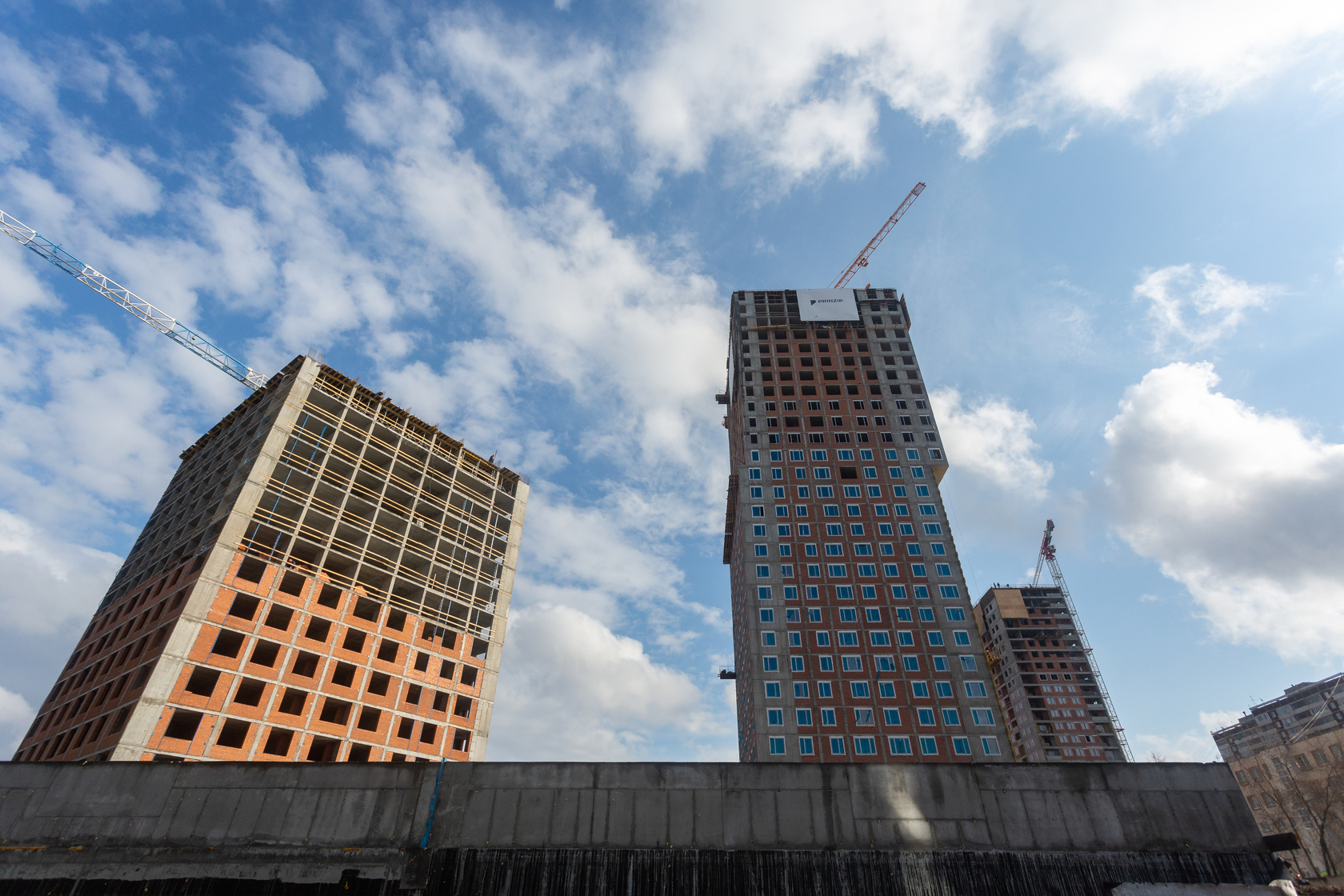 Возводим монолитные конструкции 15 этажа первого дома. Выполняем кирпичную кладку стен на 9–11 этажах.