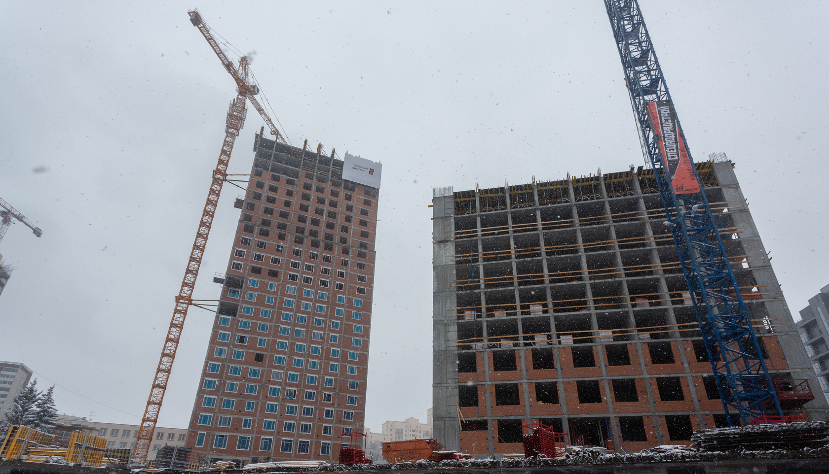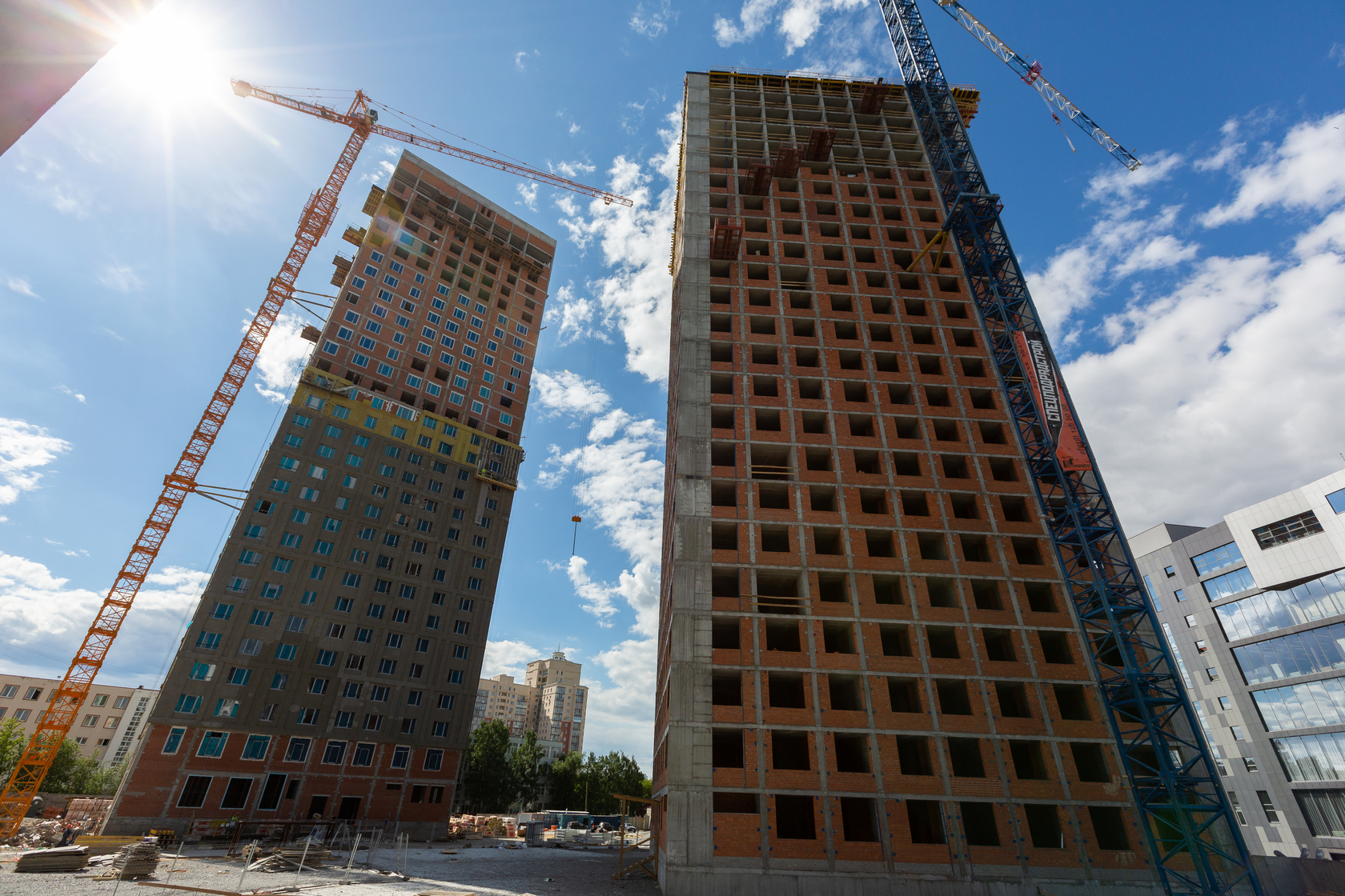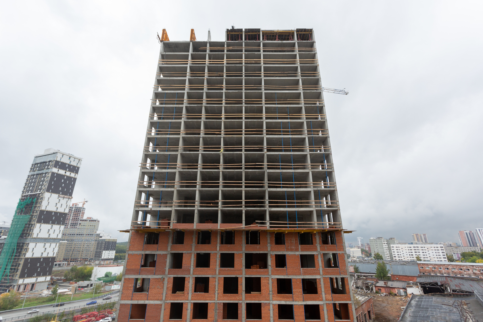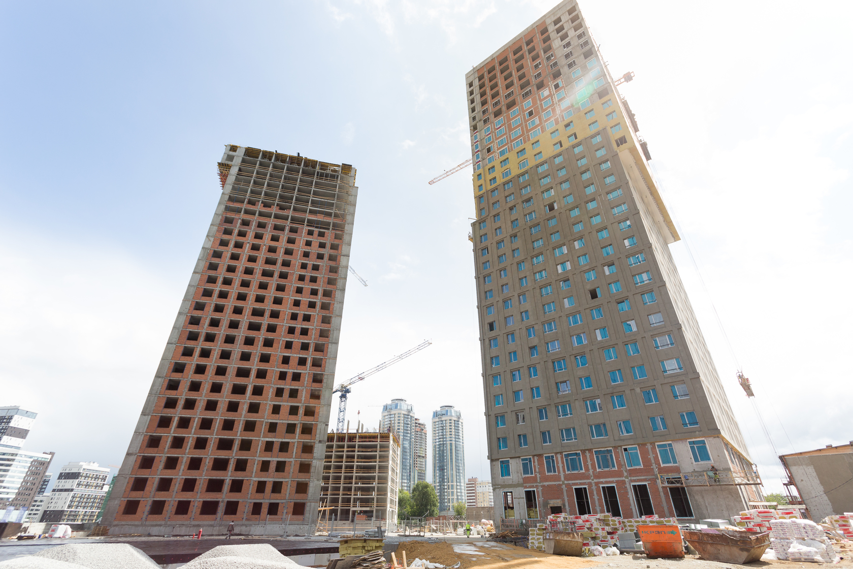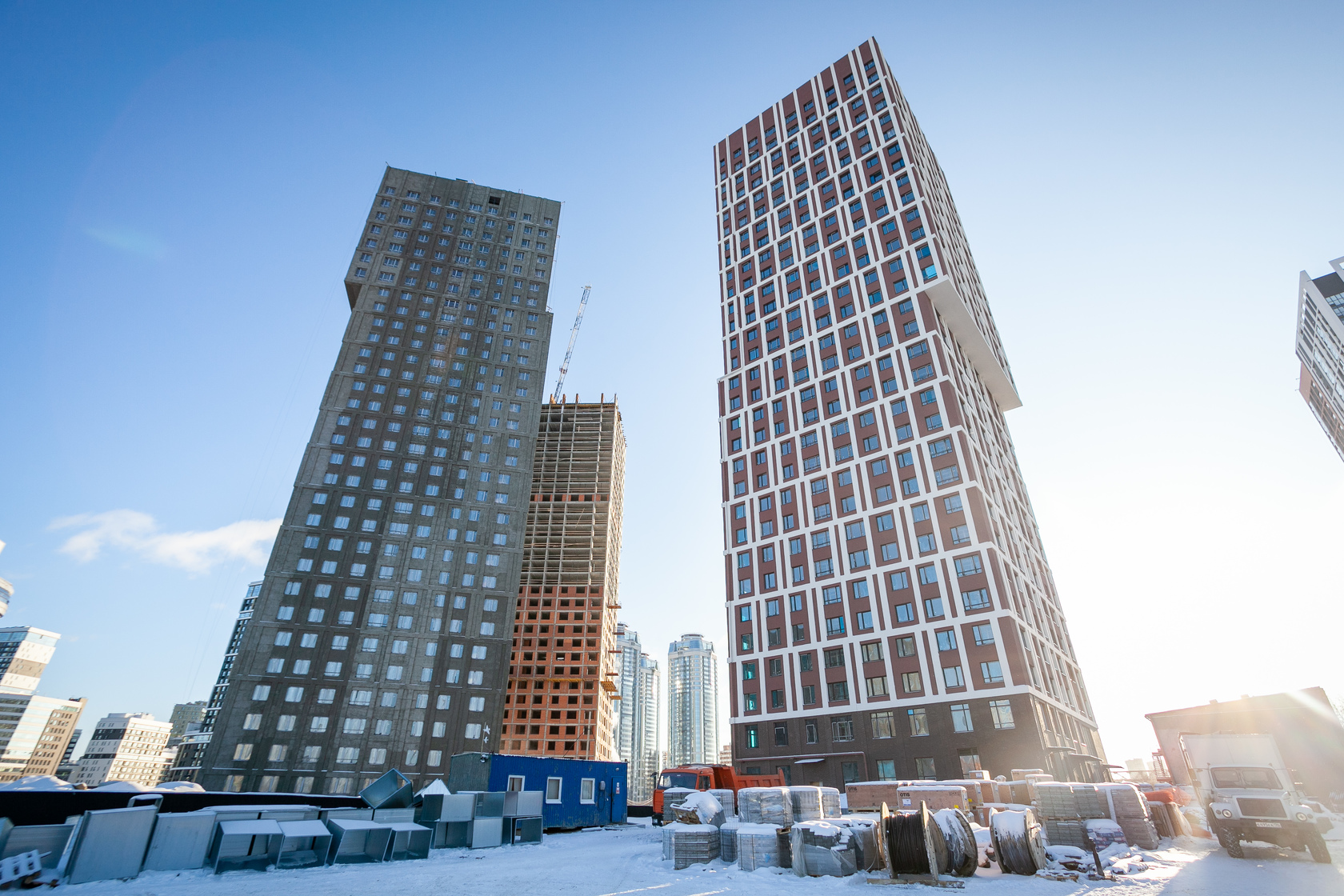Возводим монолитные конструкции 15 этажа первого дома. Выполняем кирпичную кладку стен на 9–11 этажах.
