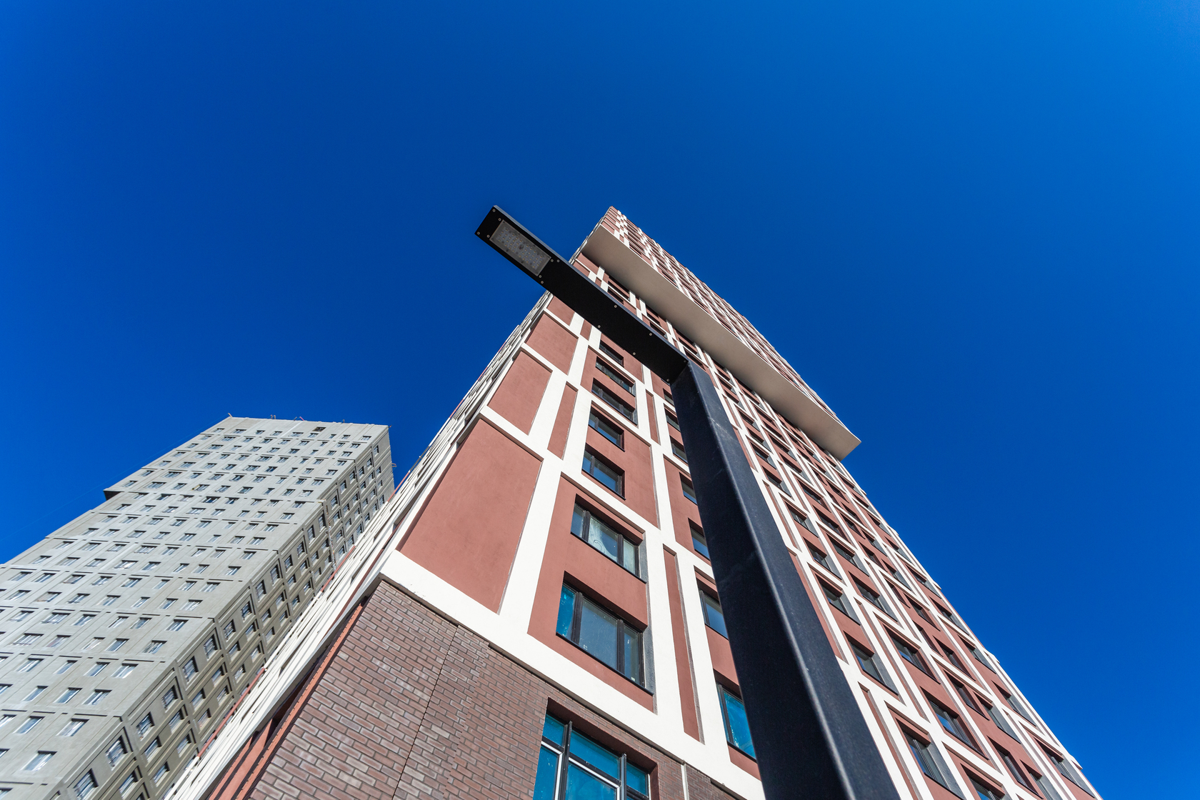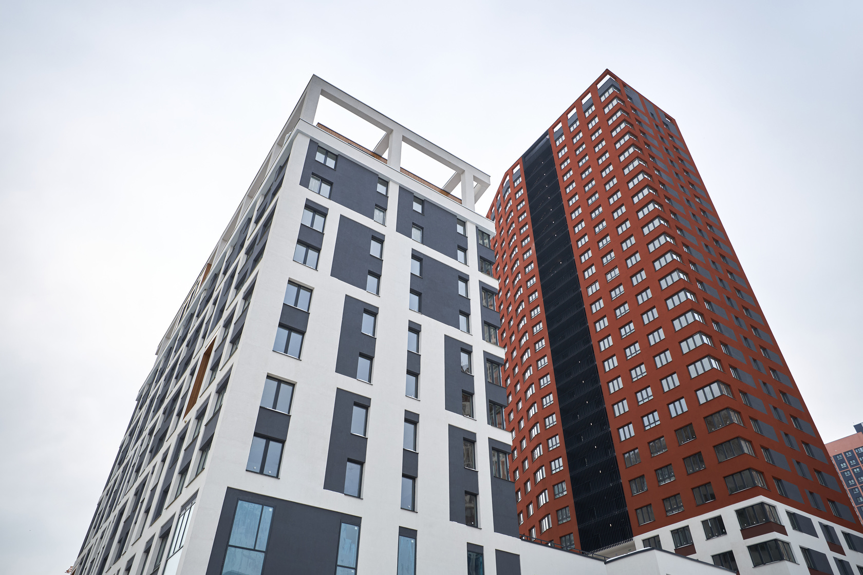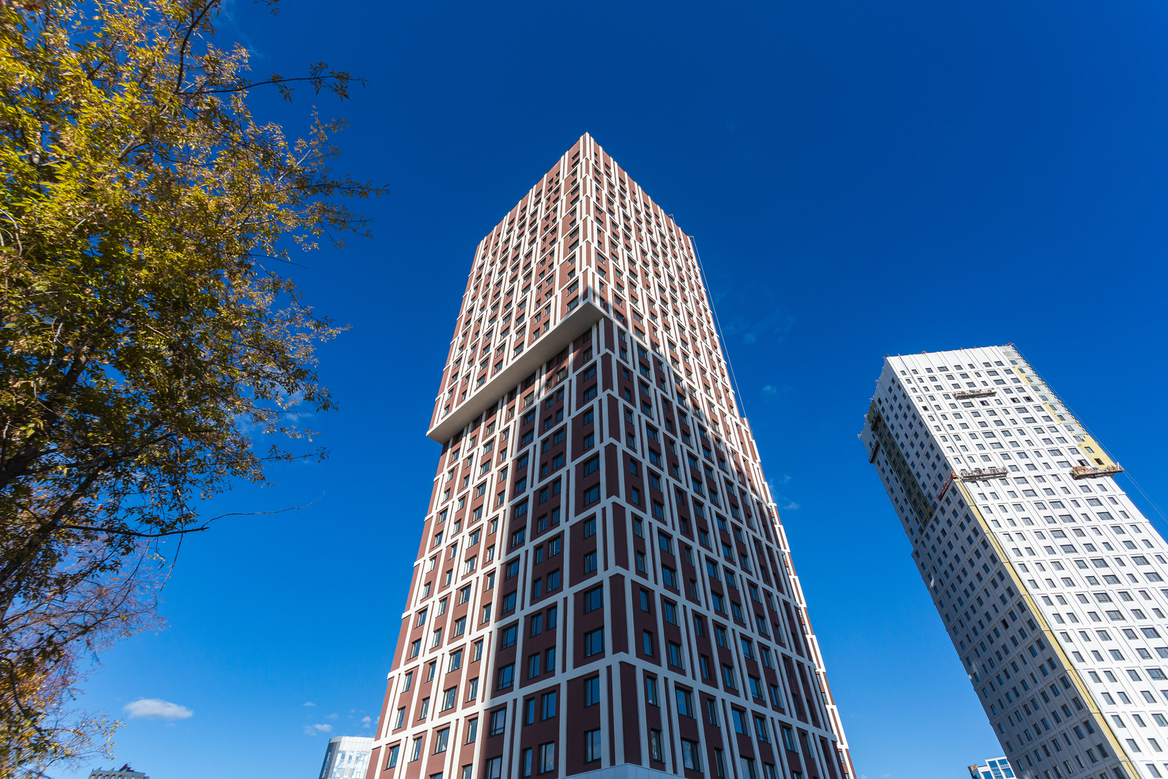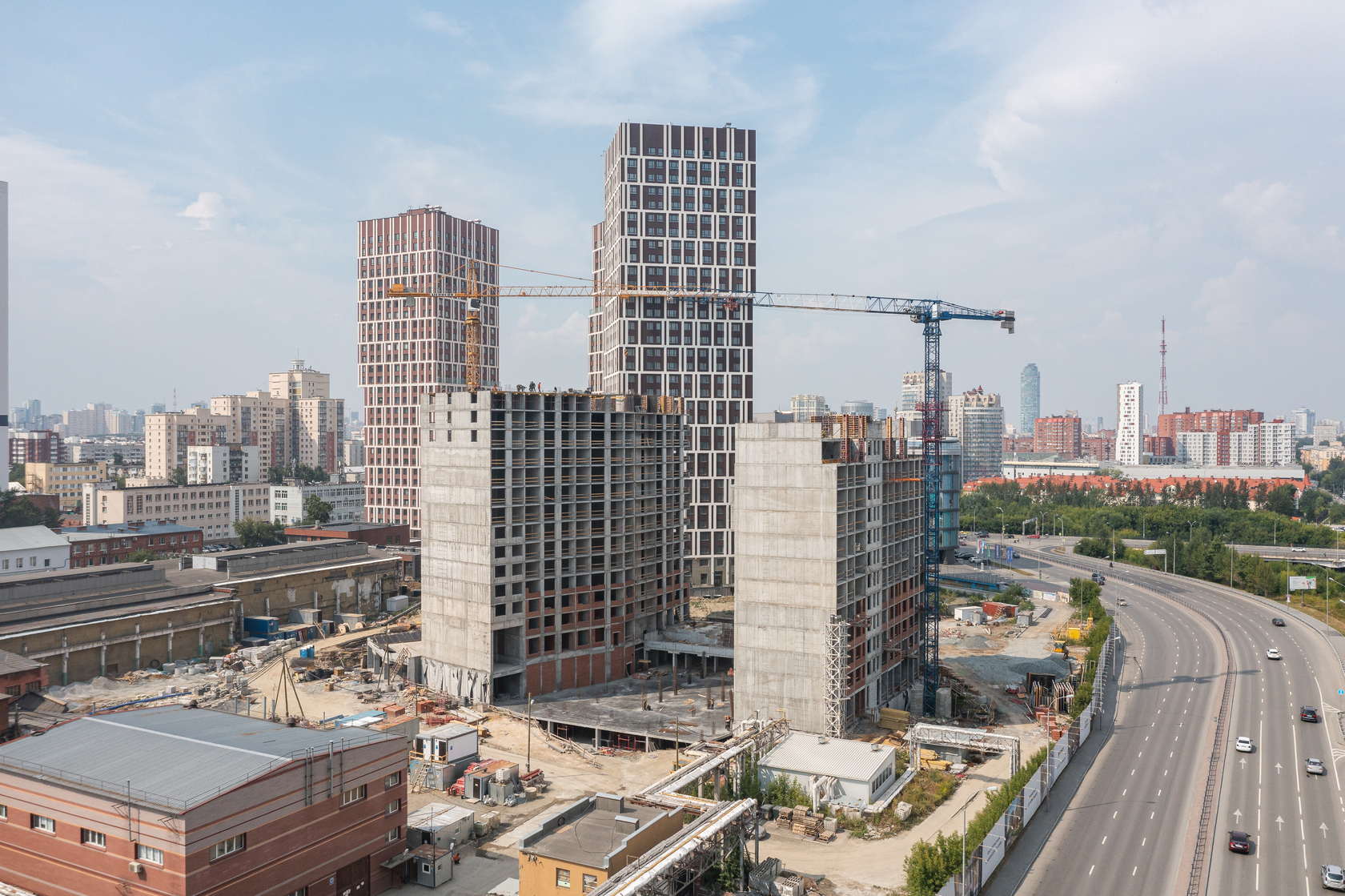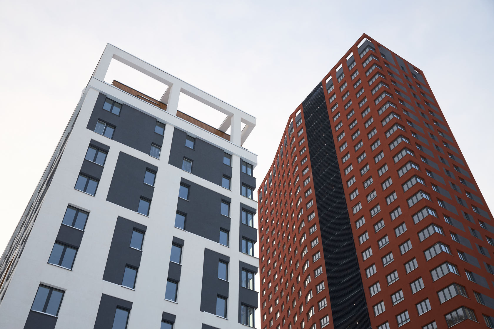 Возводим монолитные конструкции 15 этажа первого дома. Выполняем кирпичную кладку стен на 9–11 этажах.
