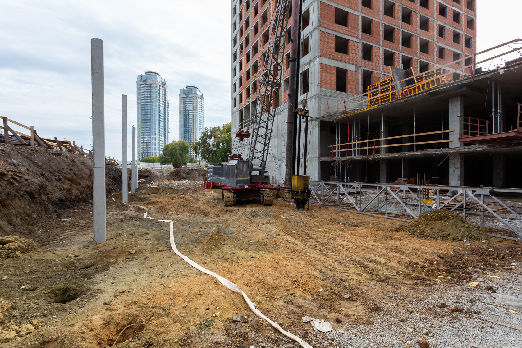 Выполняем монолитные конструкции 11 этажа первого дома. Выполняем кирпичную кладку стен на 3–6 этажах. Закончили забивку свай. Выполняем фундаменты и вертикальные конструкции паркинга.