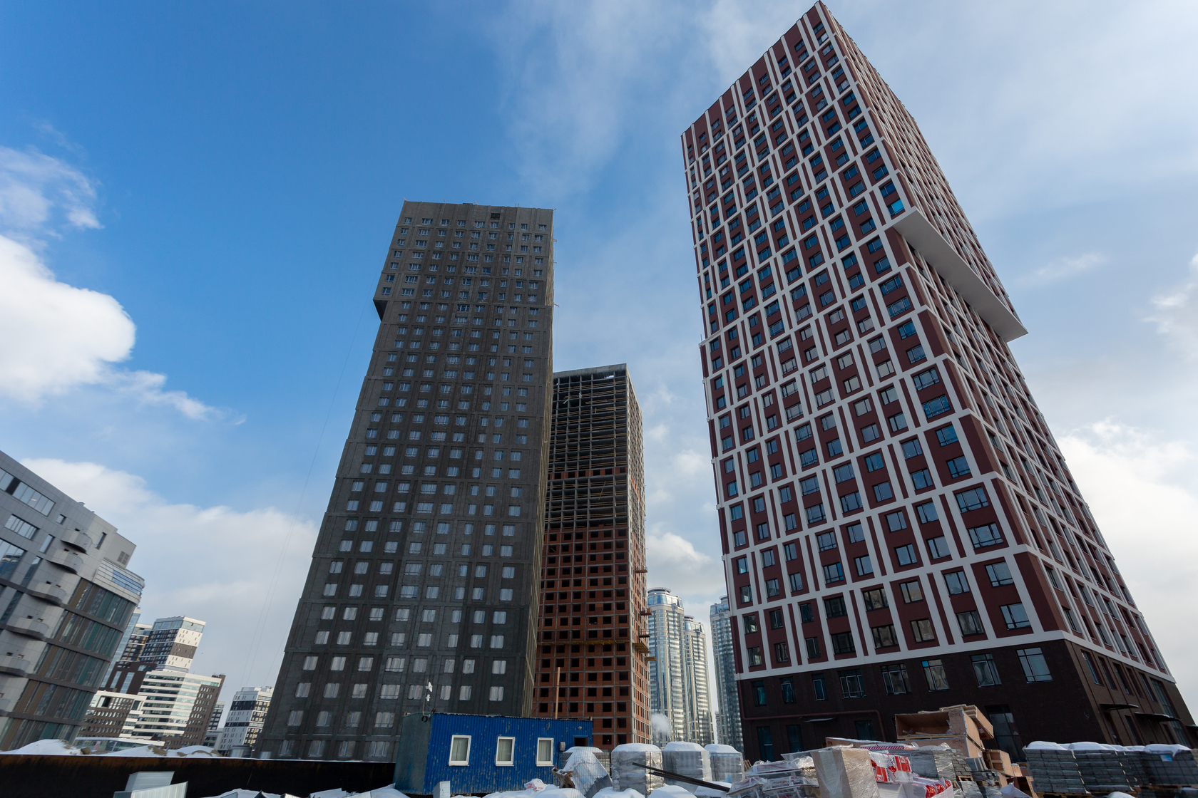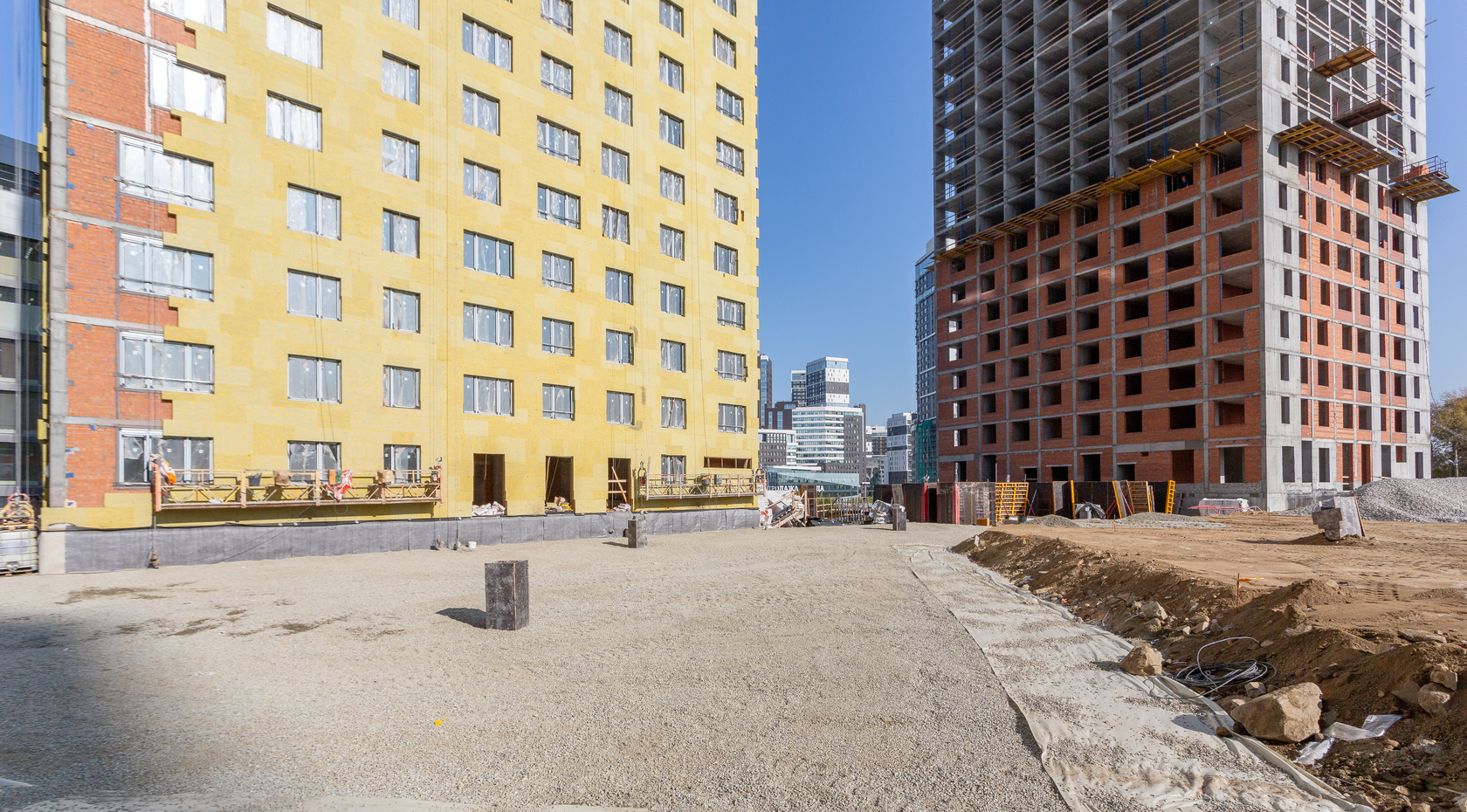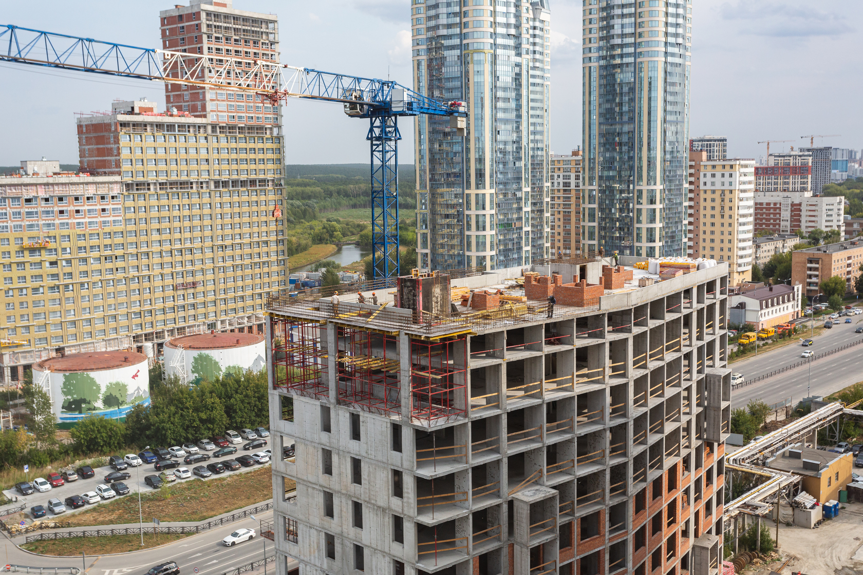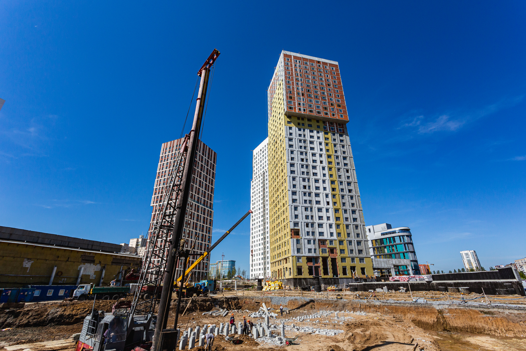 Возводим монолитные конструкции 18 этажа первого дома. Выполняем кирпичную кладку стен на 15–17 этажах. Возводим монолитные конструкции стен подземной части дома и паркинга. Забиваем сваи третьего дома.