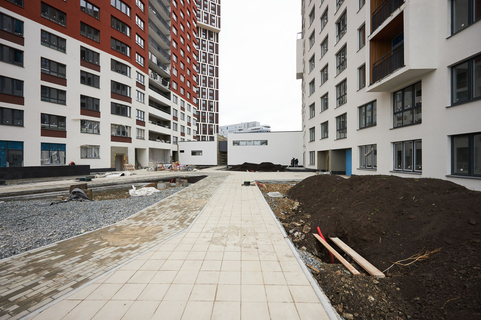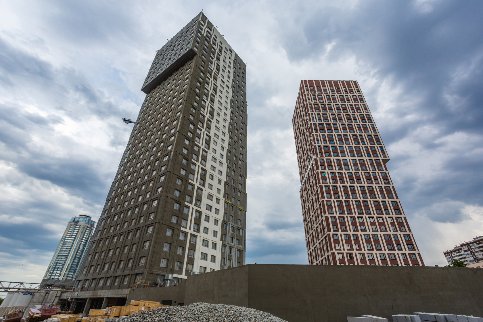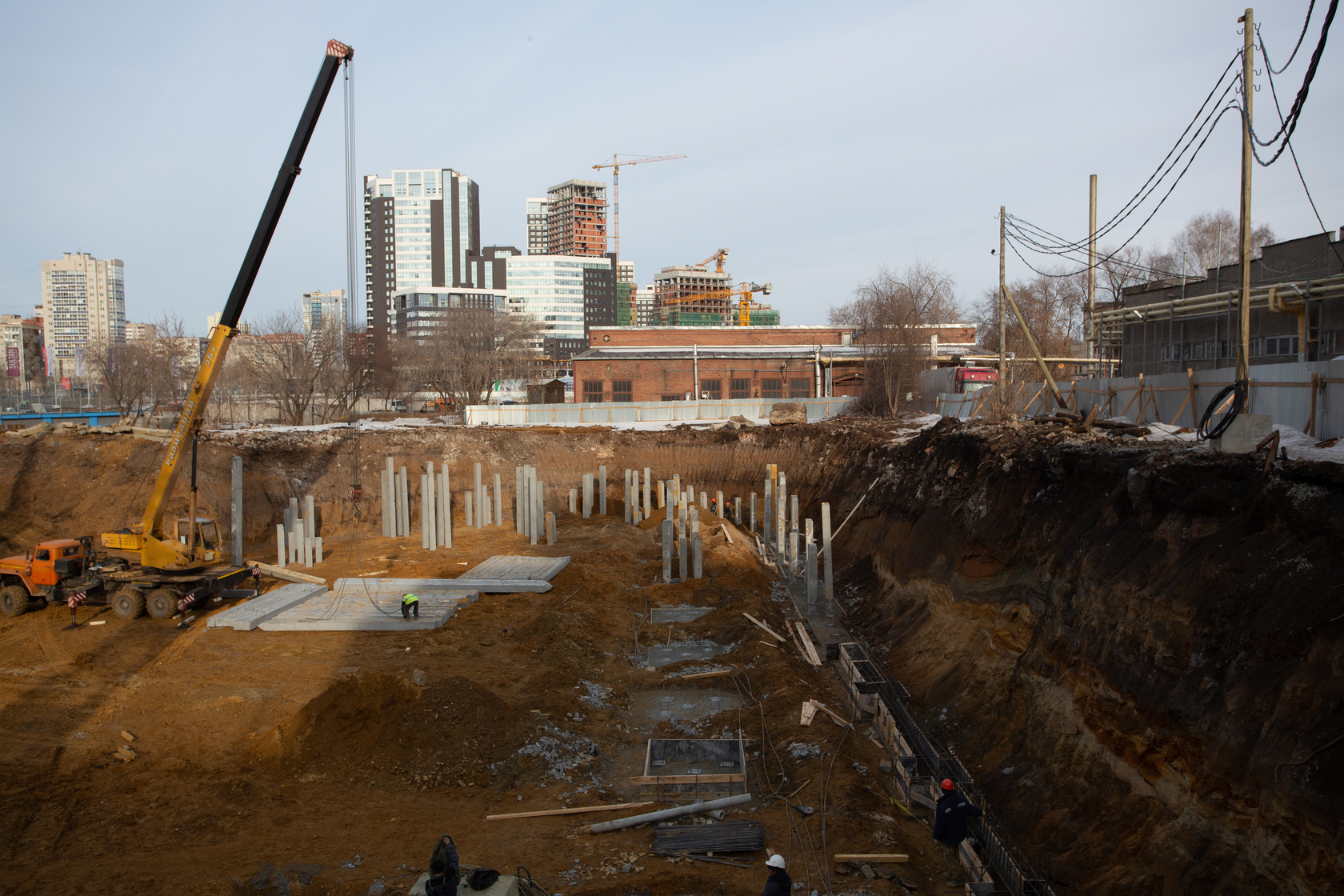 Возводим монолитные конструкции 18 этажа первого дома. Выполняем кирпичную кладку стен на 15–17 этажах. Возводим монолитные конструкции стен подземной части дома и паркинга. Забиваем сваи третьего дома.