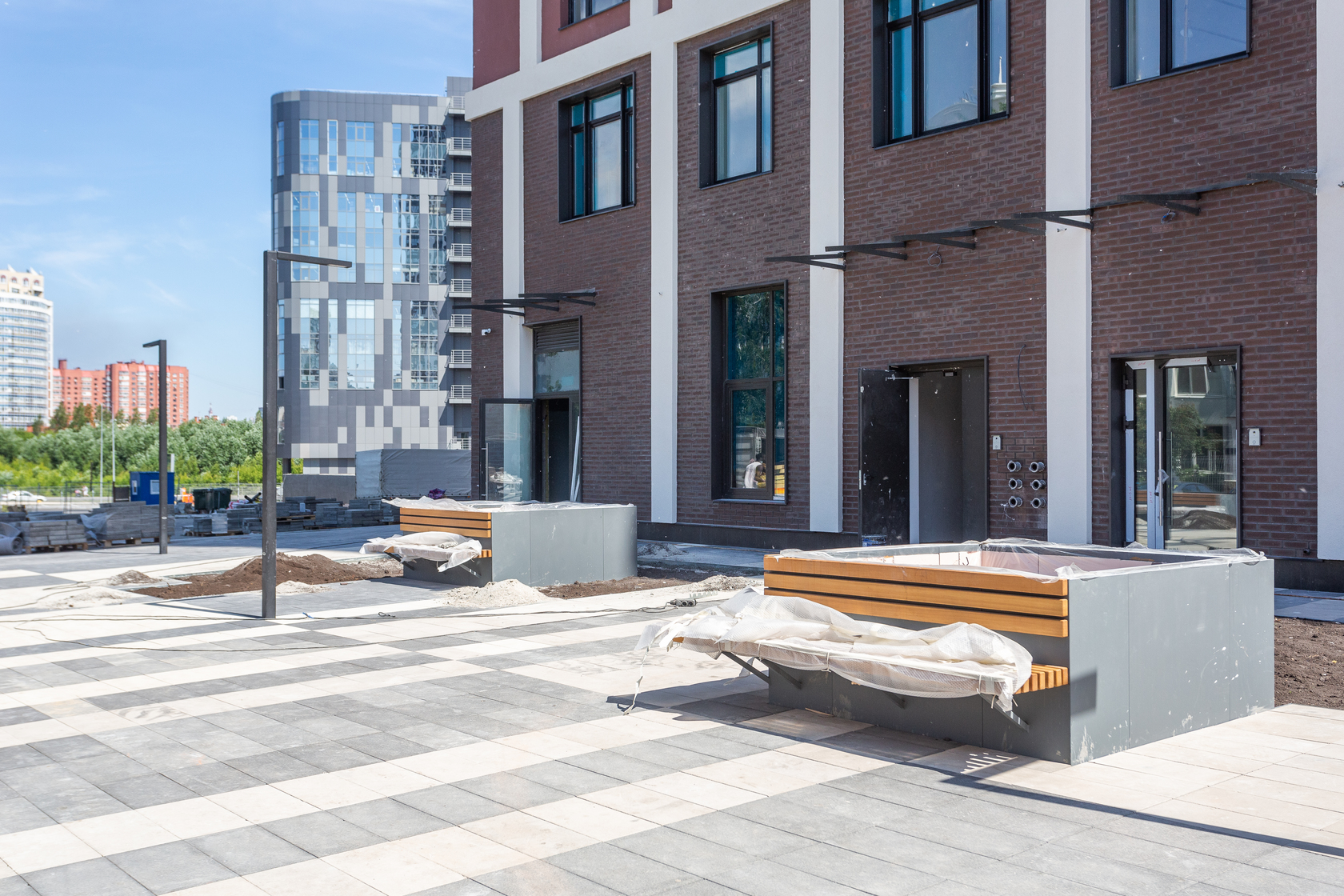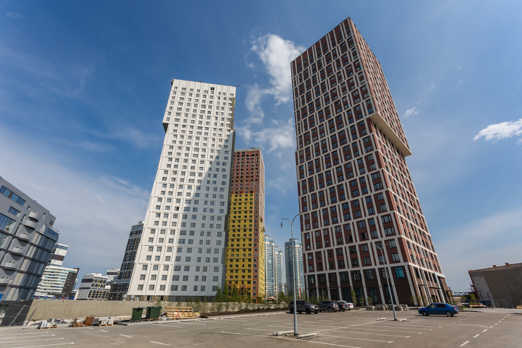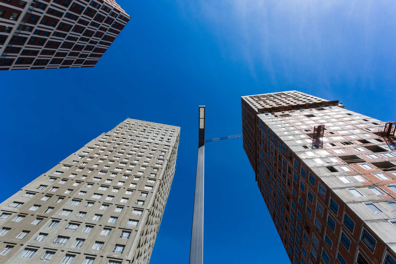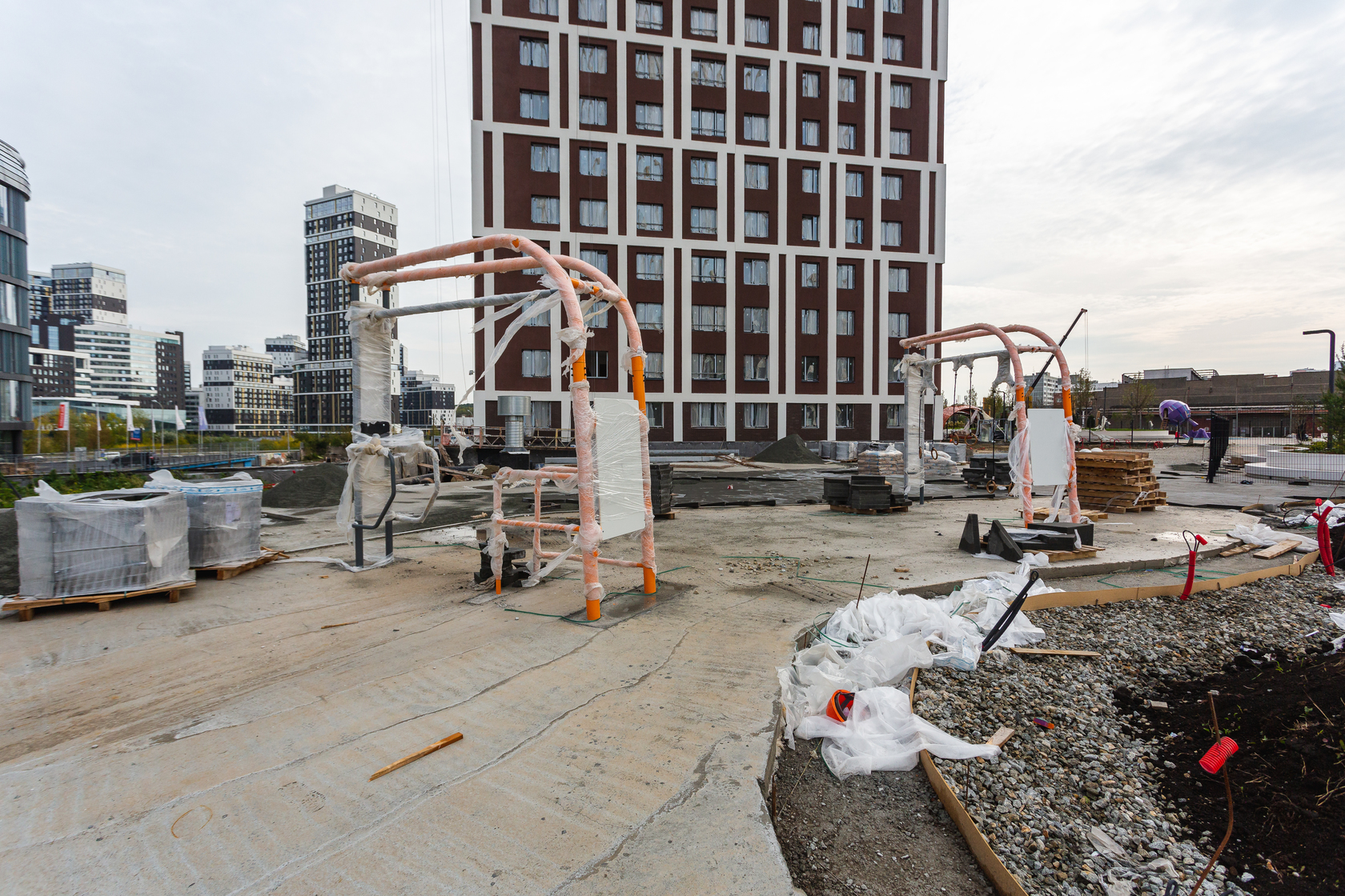 Возводим монолитные конструкции 18 этажа первого дома. Выполняем кирпичную кладку стен на 15–17 этажах. Возводим монолитные конструкции стен подземной части дома и паркинга. Забиваем сваи третьего дома.