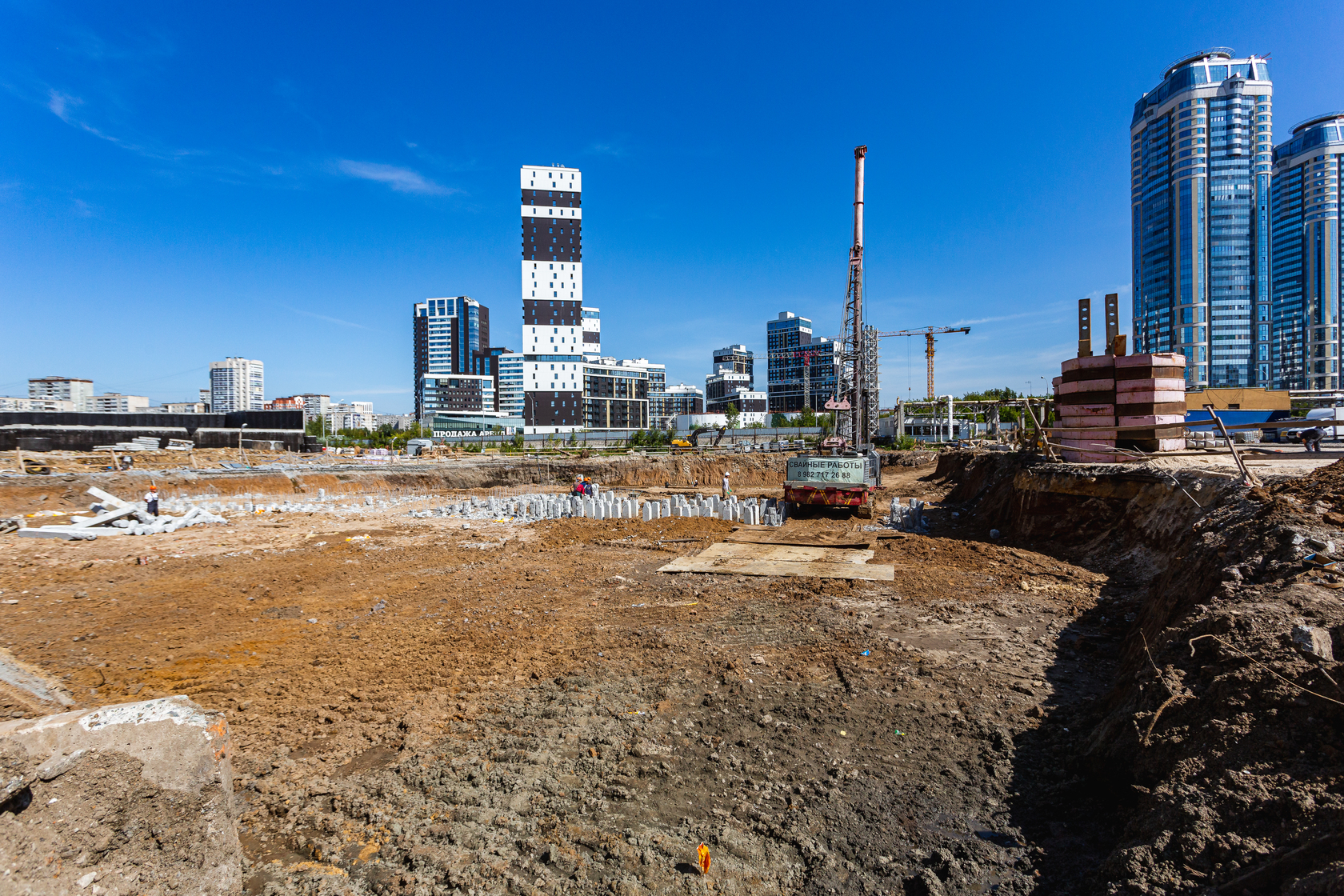 Продолжаем работы по устройству котлована. Забиваем сваи. Выполнили часть подбетонной подготовки для установки фундаментной плиты. Установили башенный кран.