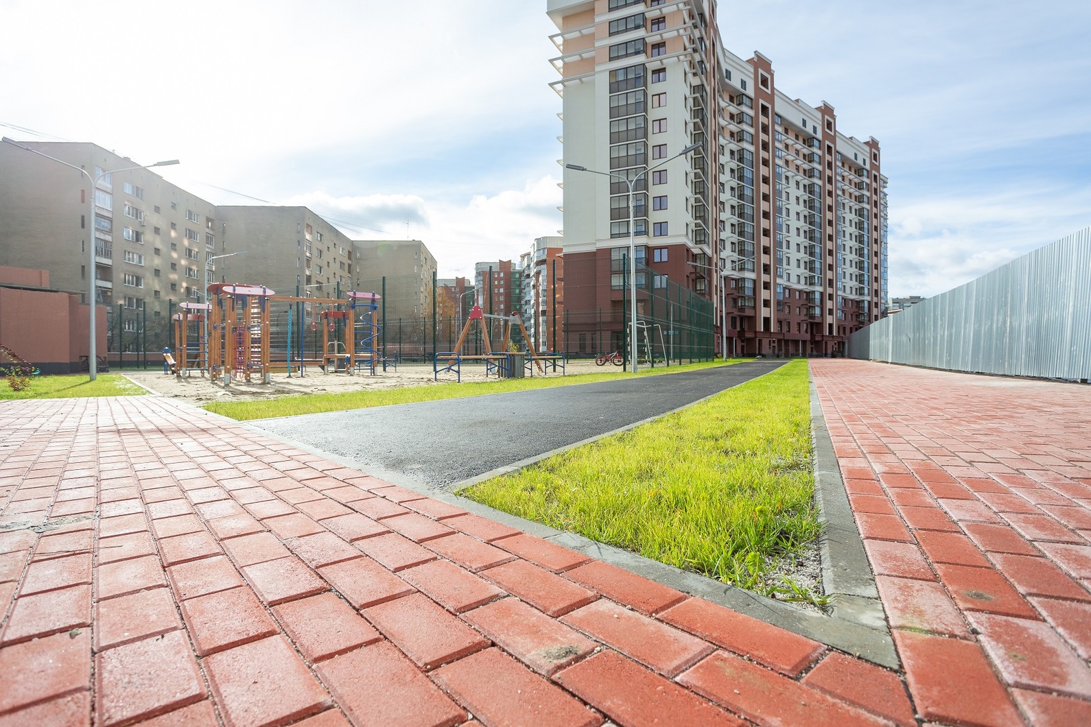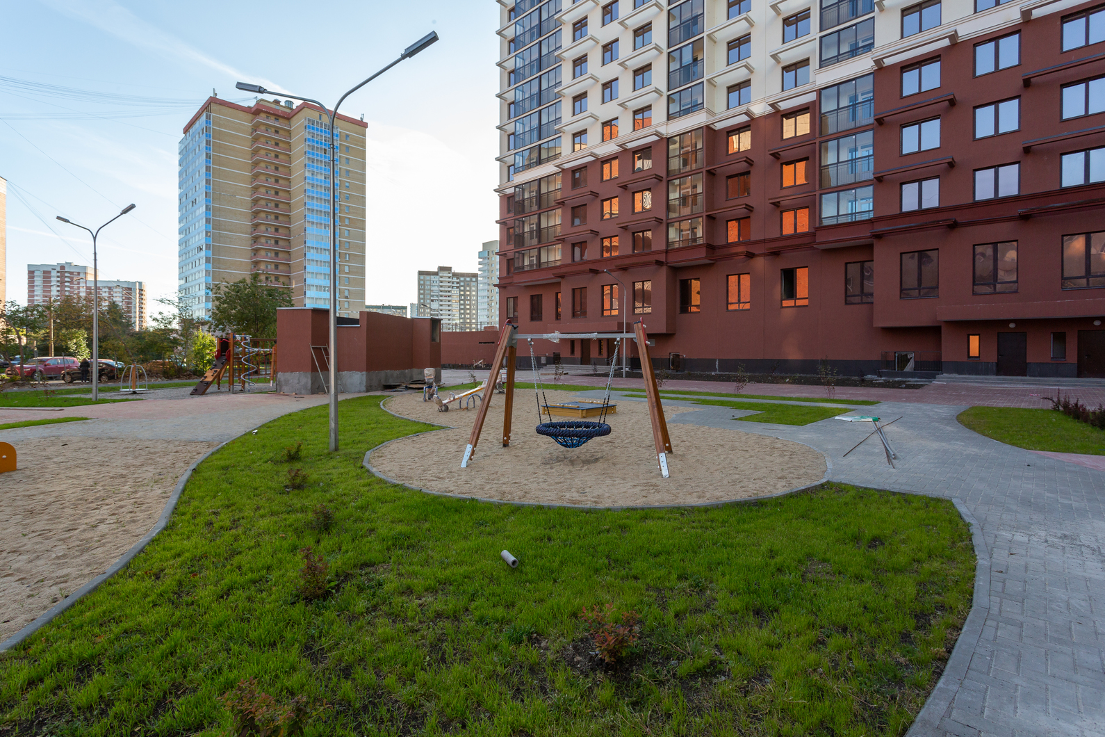 Во дворе установлены качели, карусели и детский игровой комплекс. Для детей младшего возраста предусмотрены две площадки с песочницей и безопасными качелями. Для занятий спортом есть уличные тренажеры, столы для армрестлинга и игры в теннис, баскетбольная площадка, поле для мини-футбола и велодорожка.