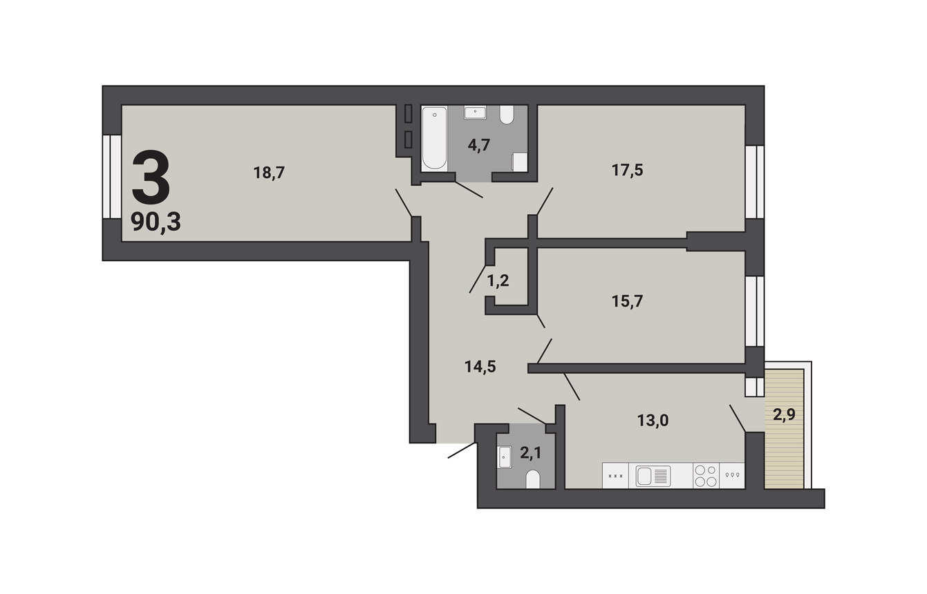 В этой квартире огромная лоджия и панорамный обзор. Есть такая же квартира, но с меньшим балконом, при этом комнаты становятся больше.