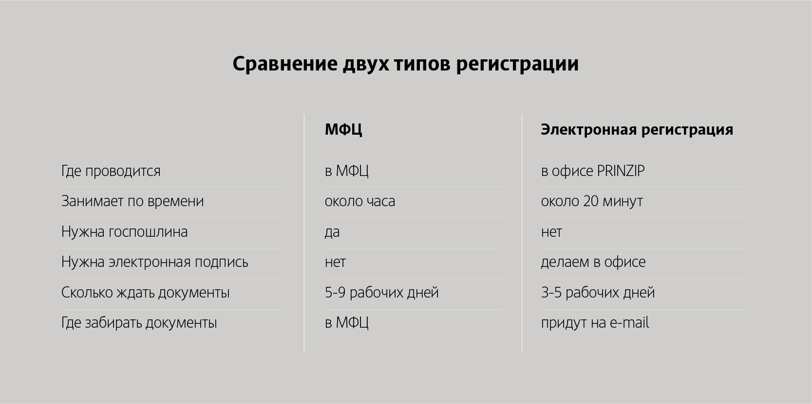 Своим клиентам мы советуем выбирать электронную регистрацию — она проходит быстрее, за чашкой кофе в офисе PRINZIP. В отдельной переговорной персональный менеджер отправит заявку в Росреестр быстро, но без спешки и суеты. Вам не придётся стоять в очереди, все процессы налажены и проходят без сбоев. При этом не надо повторно ехать за подтверждающими документами, как в случае с МФЦ — они придут на электронную почту.