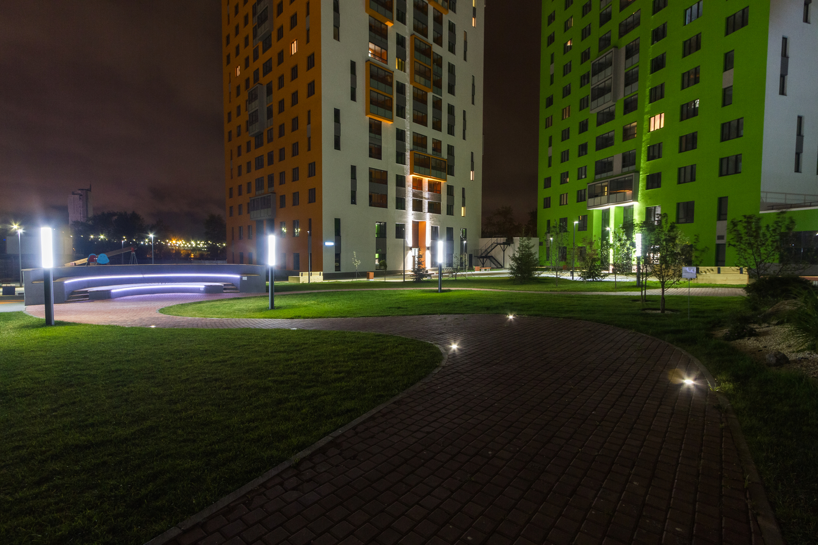Для вечерних прогулок ставим многоуровневое освещение: высокие фонари, светильники в рост человека, подсветка деревьев и светильники в покрытии. Так ходить по аллеям приятно и безопасно даже ночью.